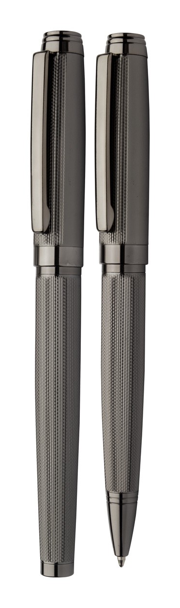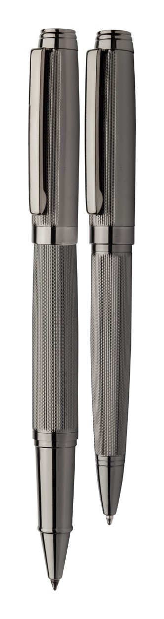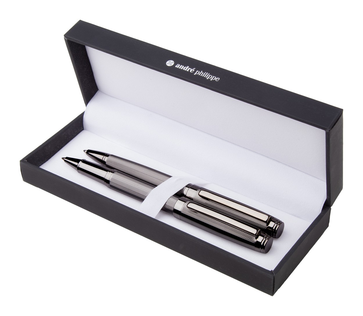 Set elegant de pix și pix roller metalic, cu butoi cu model. În cutie cadou neagră, cu reumplere albastră. Produs marca André Philippe.
