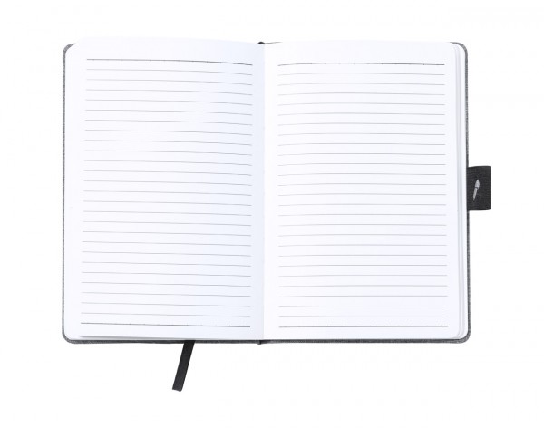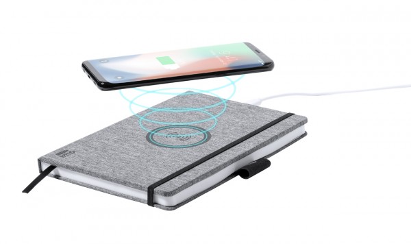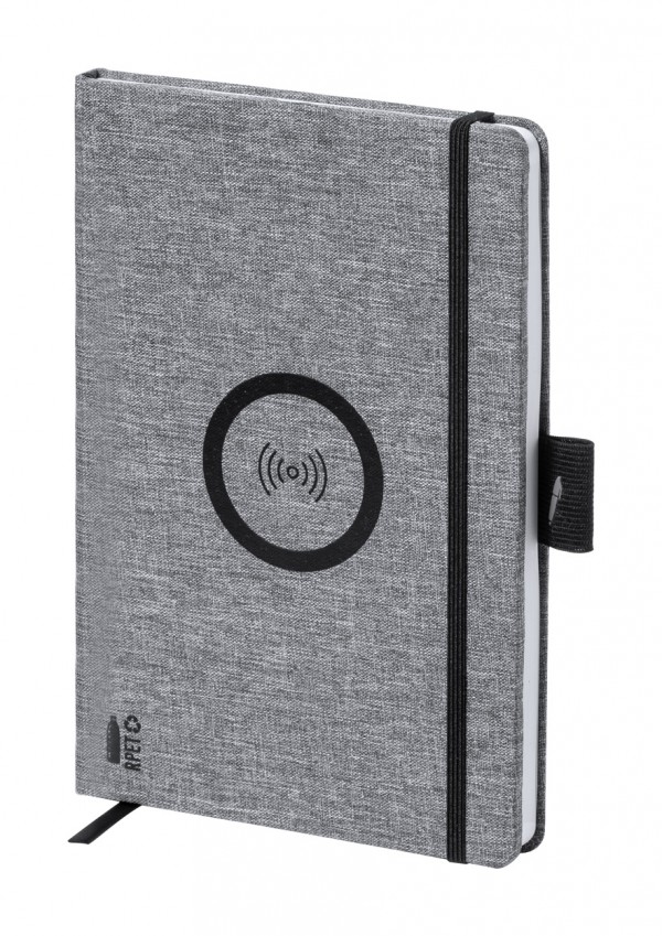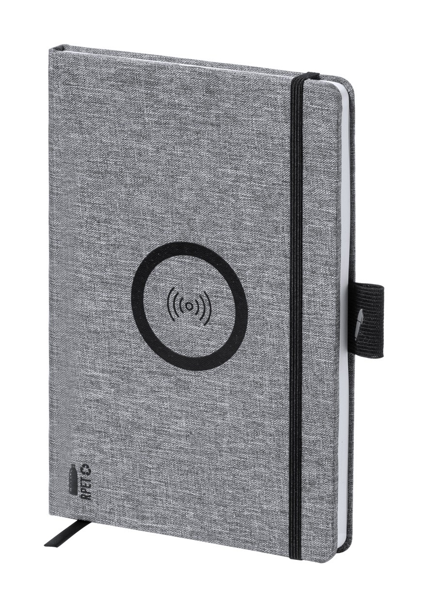 Notebook acoperit cu poliester RPET, cu încărcător rapid fără fir încorporat (10W) și 80 de coli căptușite. Dimensiune A5. Inclusiv cablu de încărcare USB. Poliester 300D RPET.
