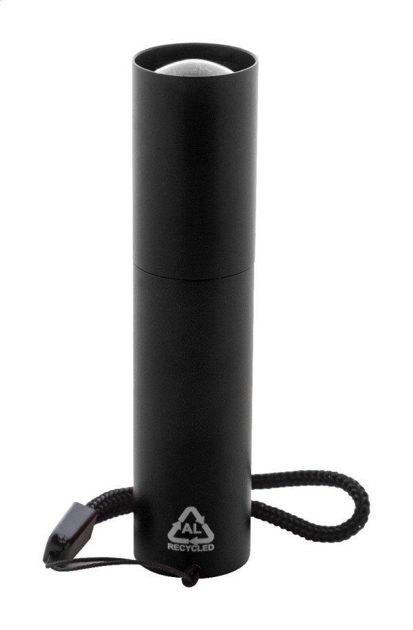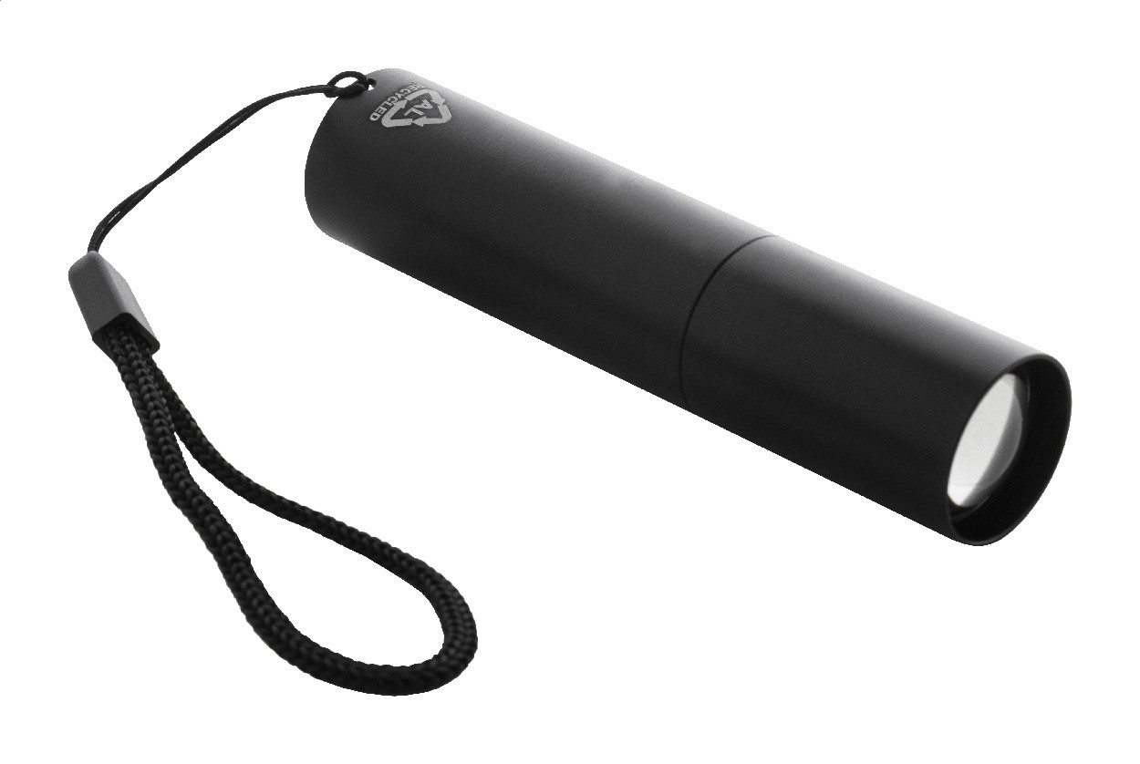 Lanternă din aluminiu reciclat cu baterie reîncărcabilă USB încorporată (400 mAh) și curea de transport. Cu lumină COB de mare putere cu zoom și 3 moduri de iluminare. Include cablu de încărcare USB.