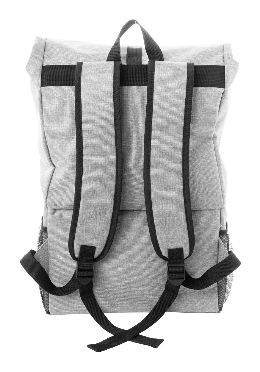 Rucsac frigorific rolltop, din RPET, cu compartiment frigorific căptușit PEVA cu fermoar pentru cutia de prânz. Cu compartiment principal de închidere cu cataramă, buzunar frontal cu fermoar, buzunare laterale din plasă și bretele căptușite. Poliester 600D RPET cu etichetă distinctivă RPET.