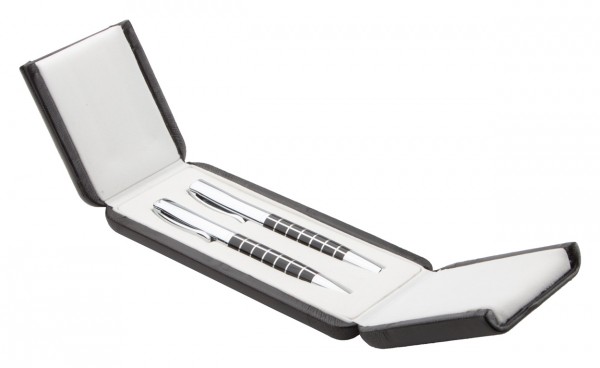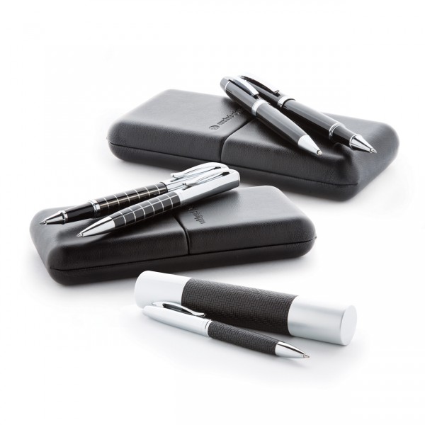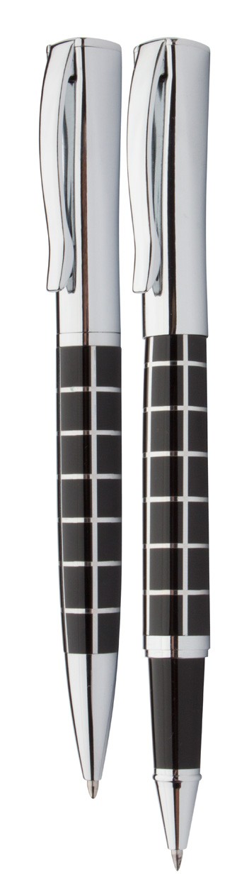 Pix şi roller elegant, metalic, cu accesorii cromate, lucioase, corp cu model. În cutie din înlocuitor piele, mină albastră.