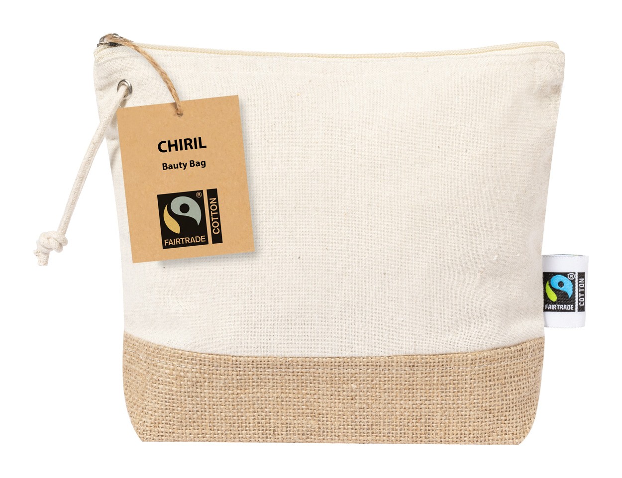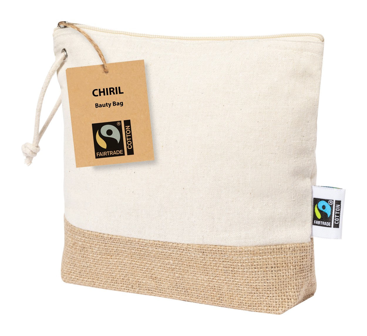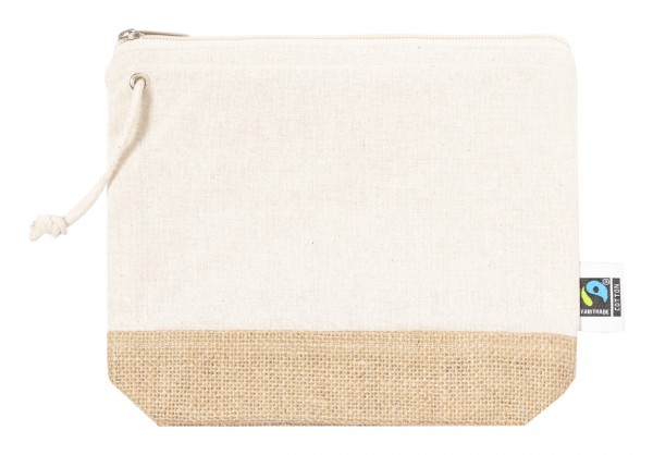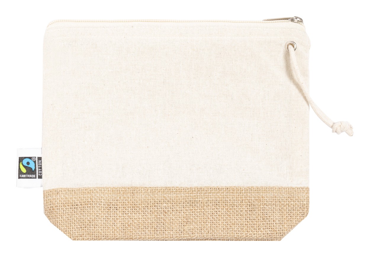 Geantă cosmetică cu fermoar, din iută laminată și bumbac Fairtrade, cu etichetă distinctă Fairtrade.