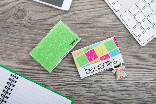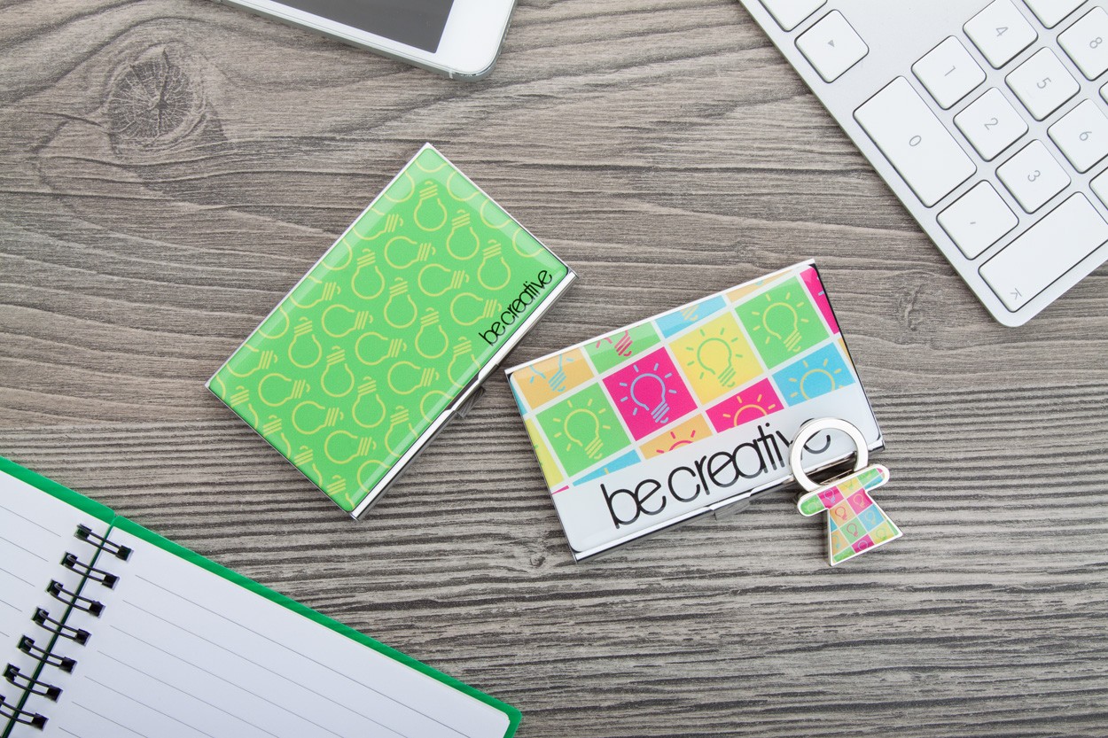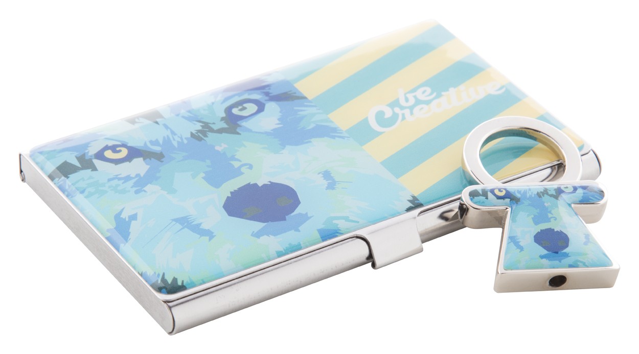 Suport cărţi de vizită şi breloc din oţel inoxidabil în cutie neagra de carton.
