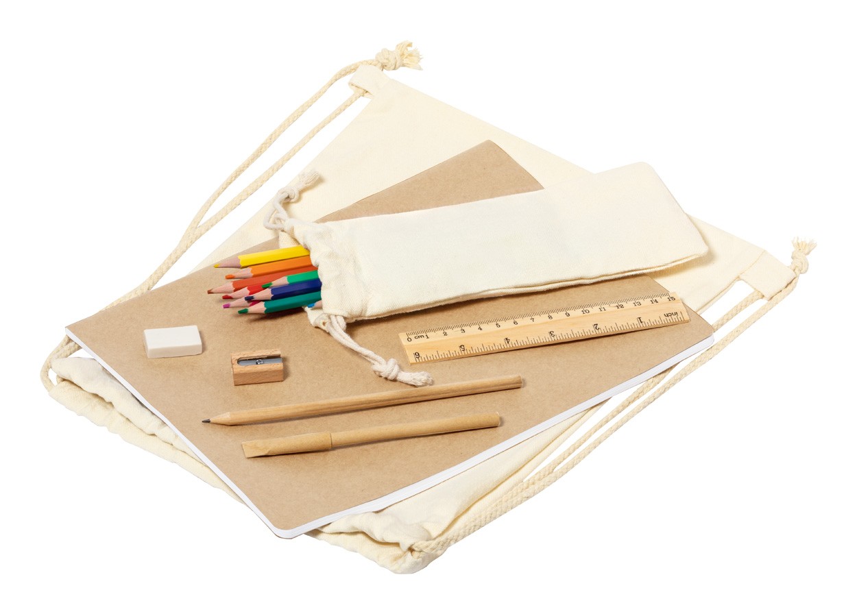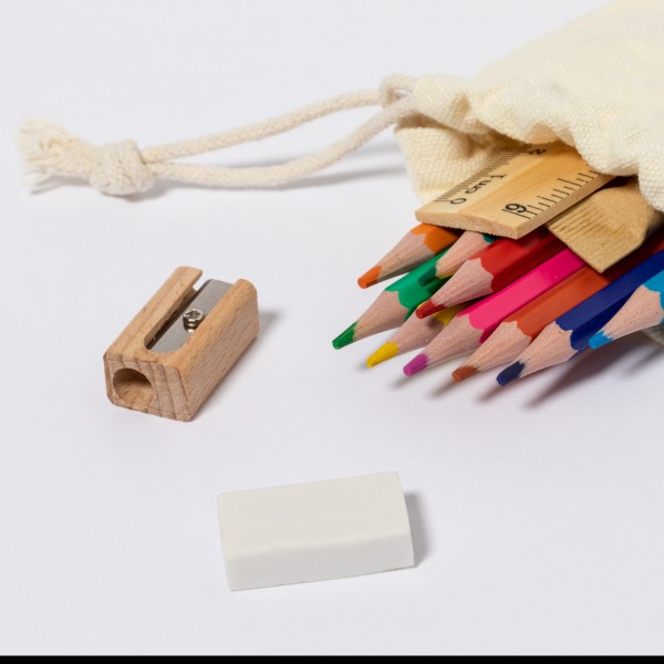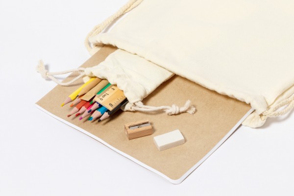 Set de desen, în husă de bumbac. Include 10 creioane colorate, 1 ascuțitoare, 1 riglă, 1 radieră, 1 creion, 1 stilou din hârtie reciclată și blocnotes de 50 de coli.