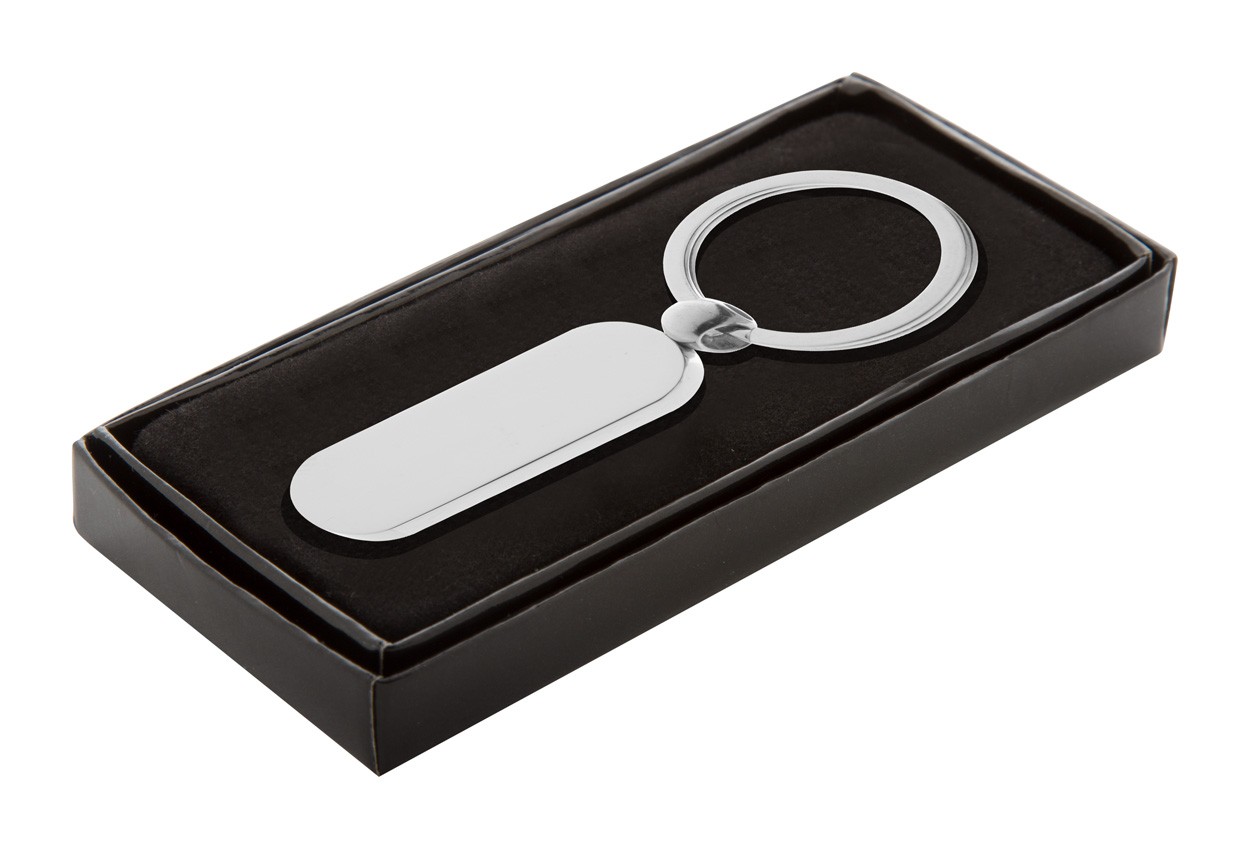Breloc metalic în cutie neagră de cadou.