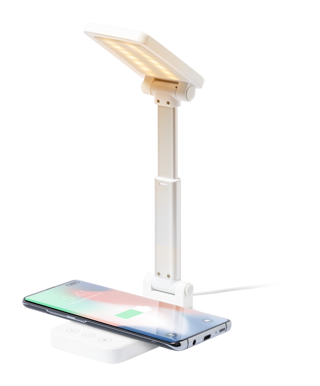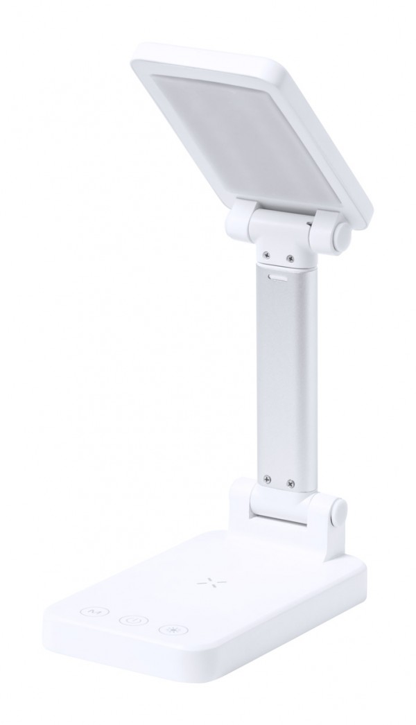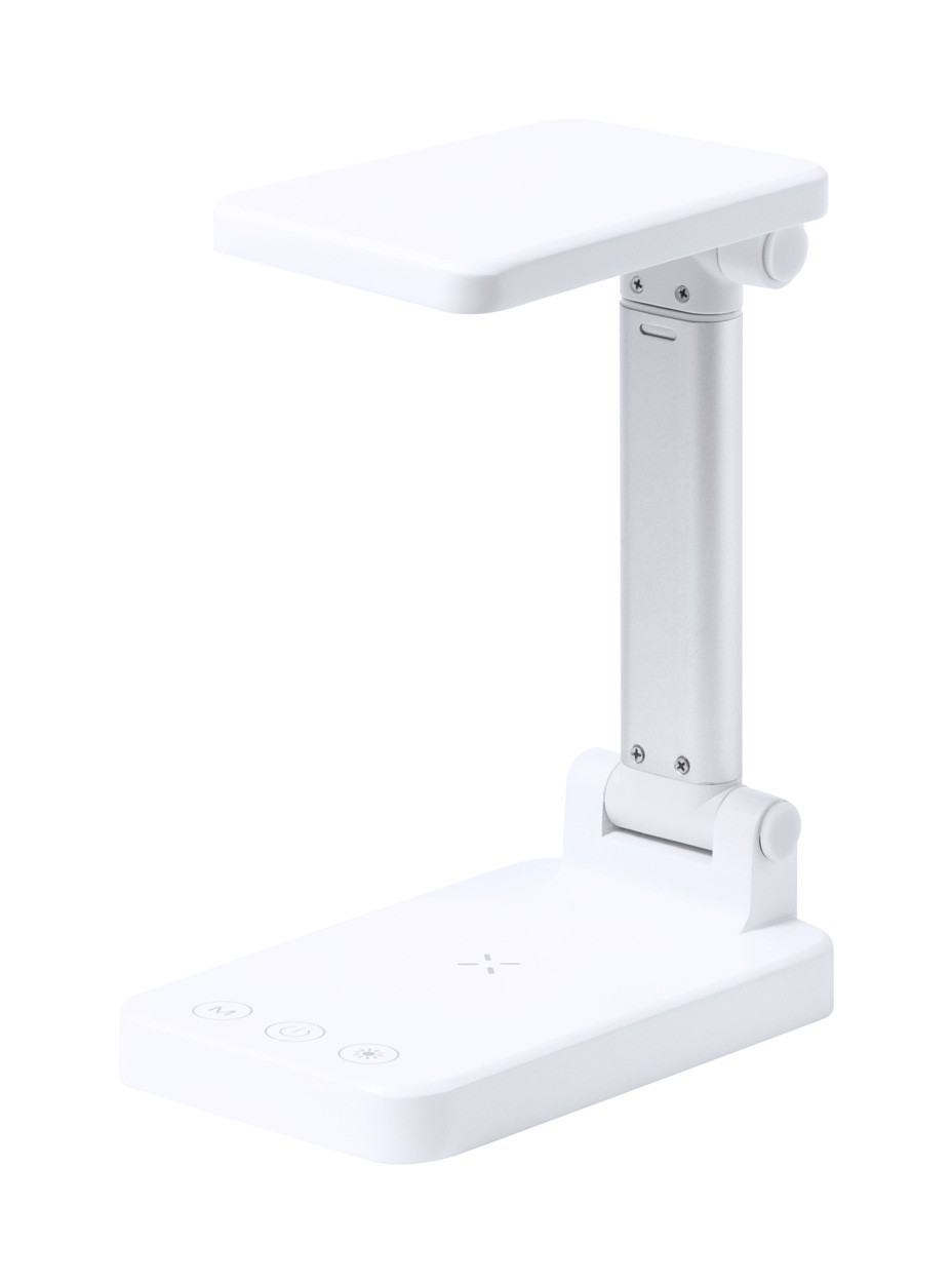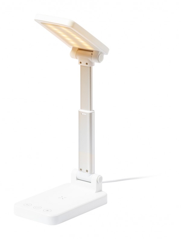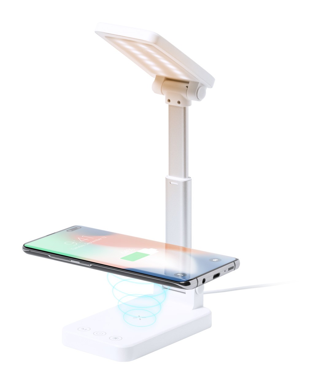 Lampă de birou multifuncțională, pliabilă, din aluminiu și plastic ABS, cu 28 de LED-uri și 3 tipuri de lumină (caldă, albă și rece), luminozitate și înălțime reglabile. Cu baterie de 3000 mAh, încărcător rapid wireless încorporat (10W) și port pentru încărcător USB pentru încărcarea a 2 dispozitive simultan (1 fără fir și 1 prin cablu). Max. ieșire: 2000 mA. Inclusiv cablu de încărcare USB.
