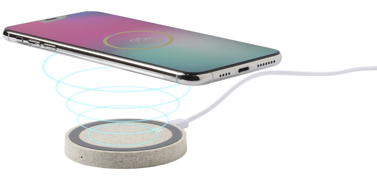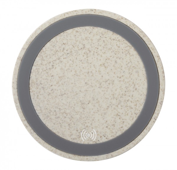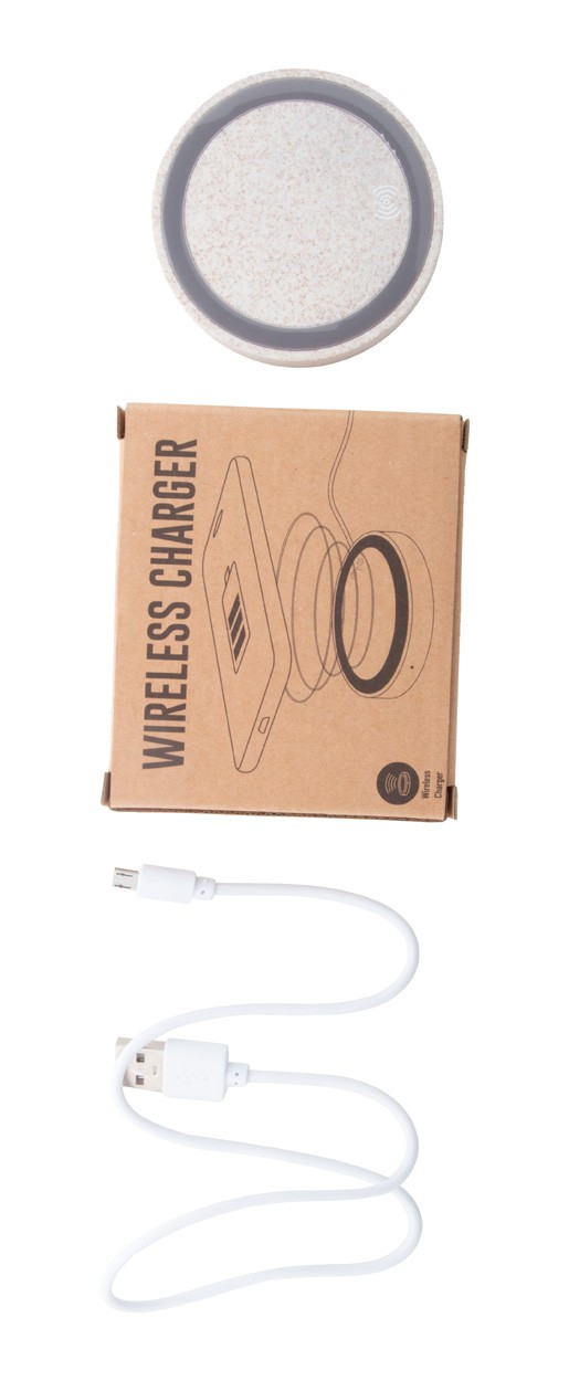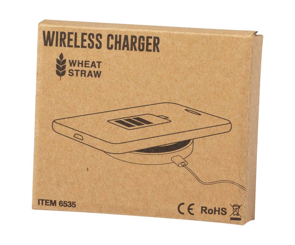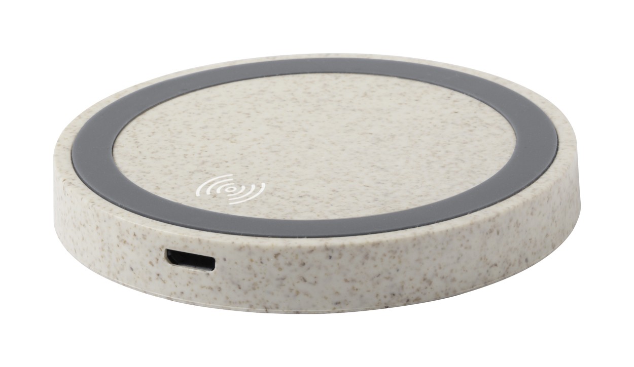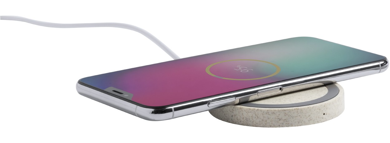Încărcător wireless în carcasă rotundă din plastic ecologic din paie de grâu, cu bază antiderapantă. Max. putere: 1000 mA. Cablul USB inclus.