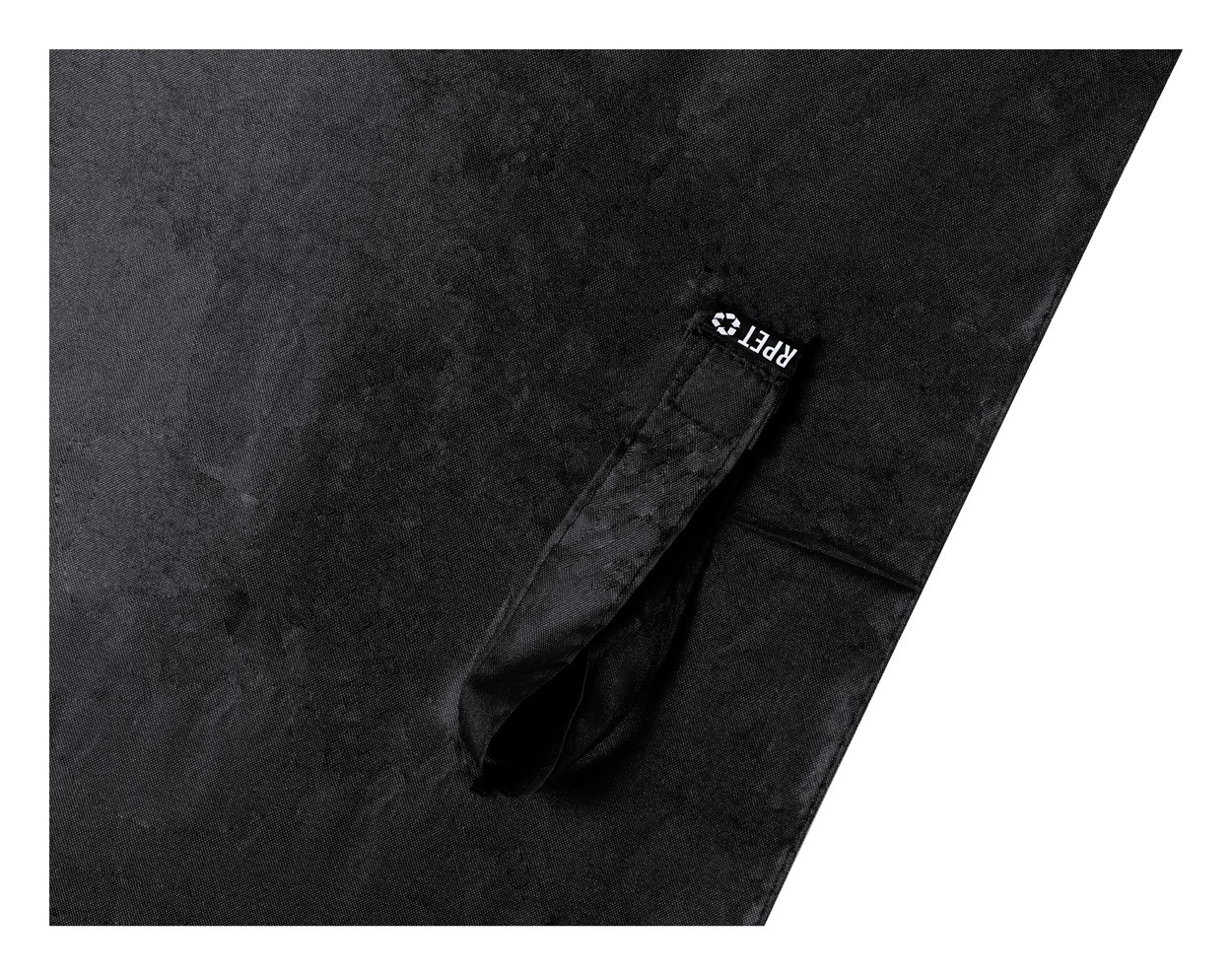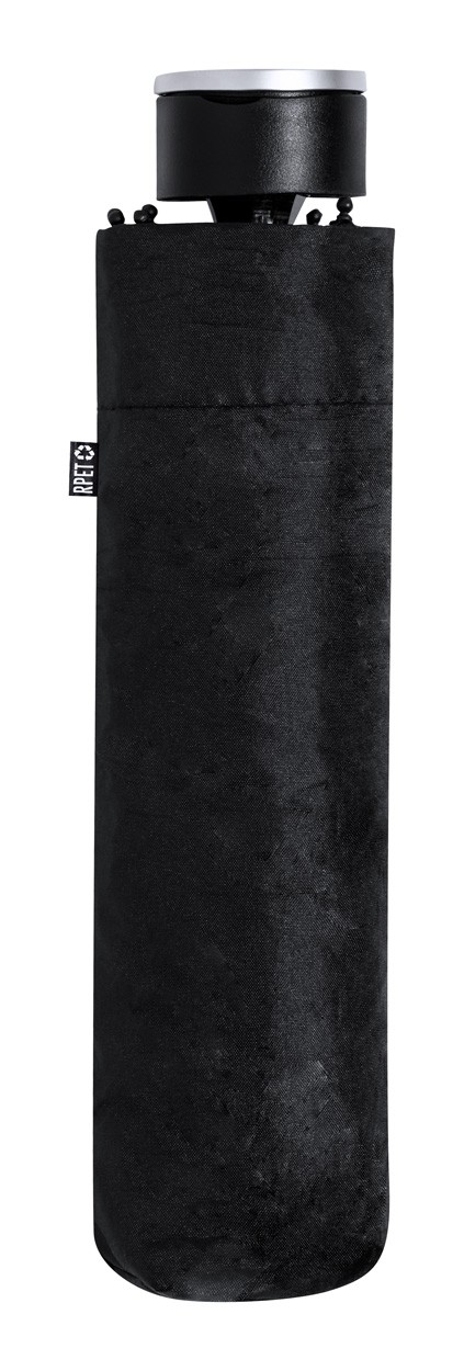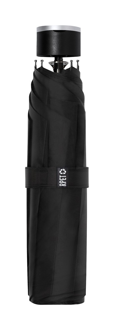 Umbrelă pliabilă, manuală, rezistentă la vânt, cu 8 panouri în husă de culoare asortată. Cu cadru metalic, nervuri din fibră de sticlă și mâner din plastic. Pongee 190T RPET. Cu etichetă distinctivă RPET.