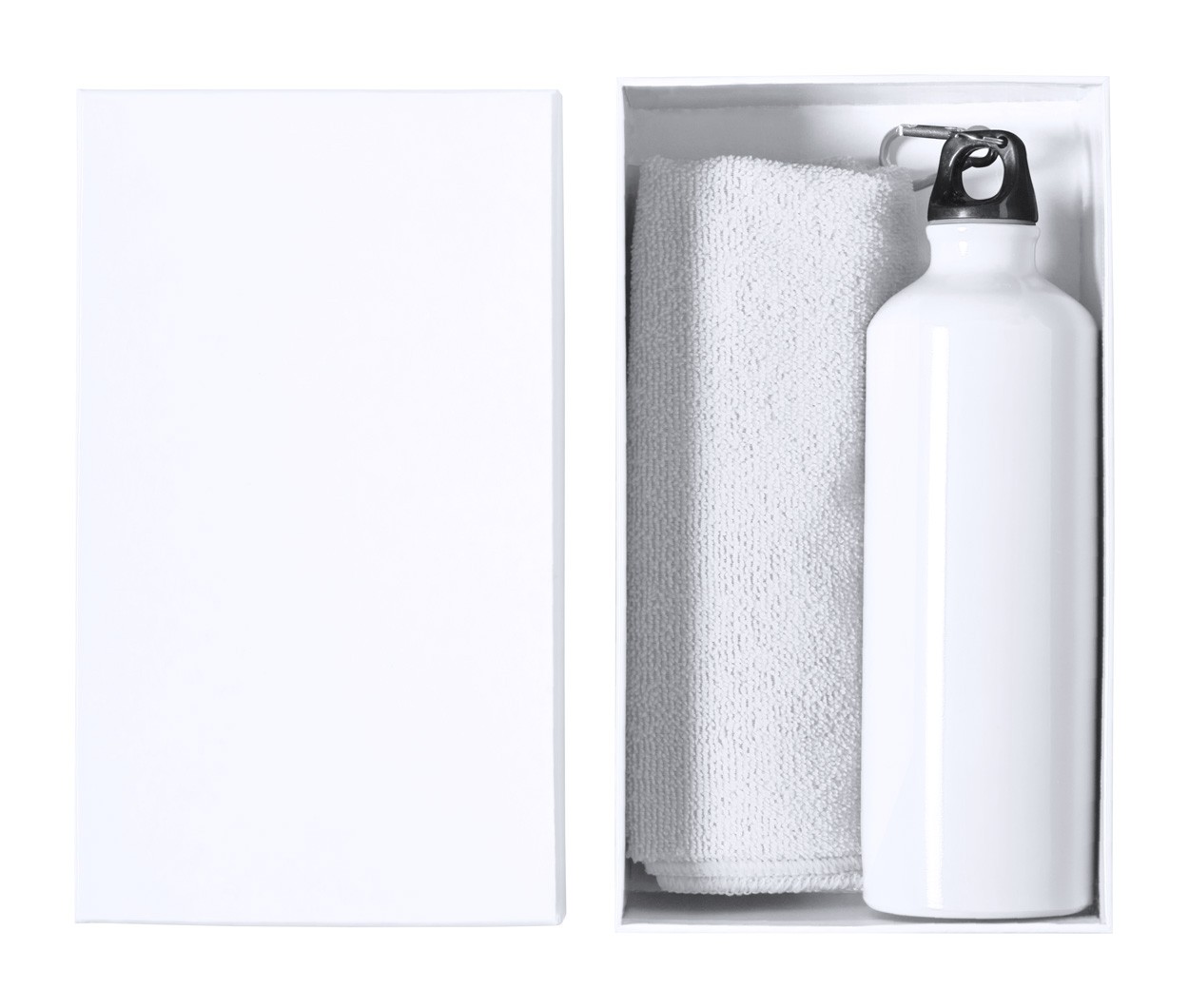 Set cadou, sport, cu sticlă sport din aluminiu, cu carabină (800 ml) și un prosop din microfibră de 40x90 cm (160 g/m²), în cutie cadou de culoare asortată. Sticla nu este potrivită pentru băuturi carbogazoase.