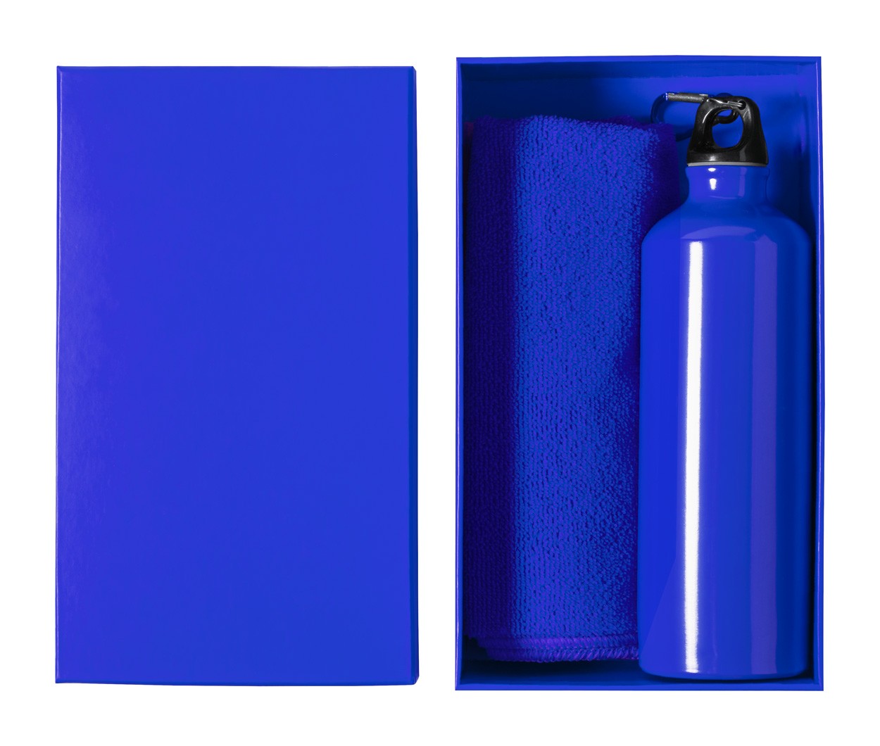Set cadou, sport, cu sticlă sport din aluminiu, cu carabină (800 ml) și un prosop din microfibră de 40x90 cm (160 g/m²), în cutie cadou de culoare asortată. Sticla nu este potrivită pentru băuturi carbogazoase.