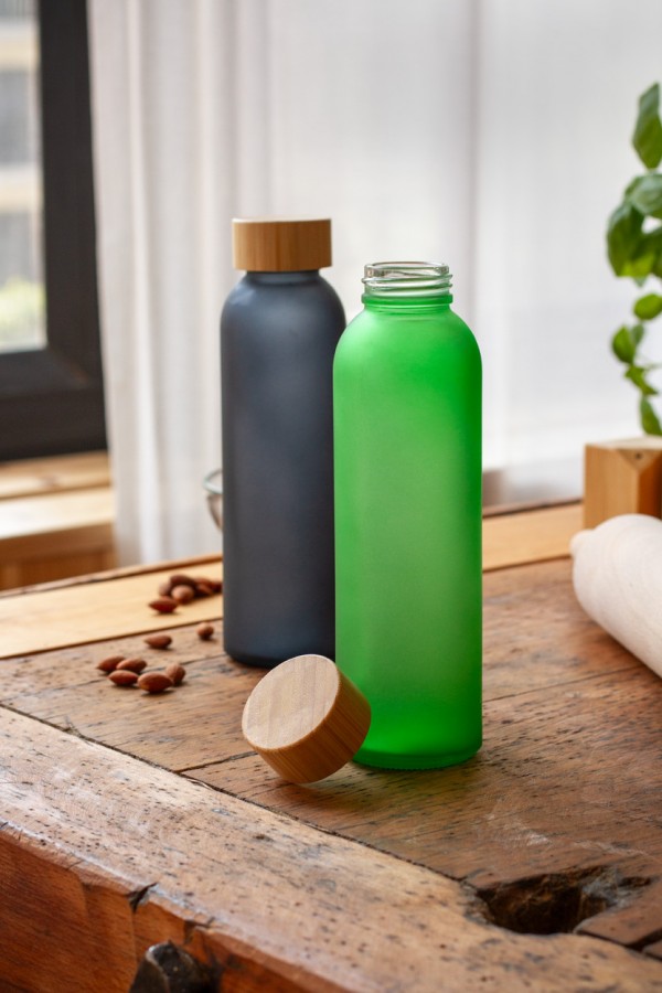 Sticlă mată cu capac din bambus, 500 ml. Nu este potrivită pentru băuturi carbogazoase.