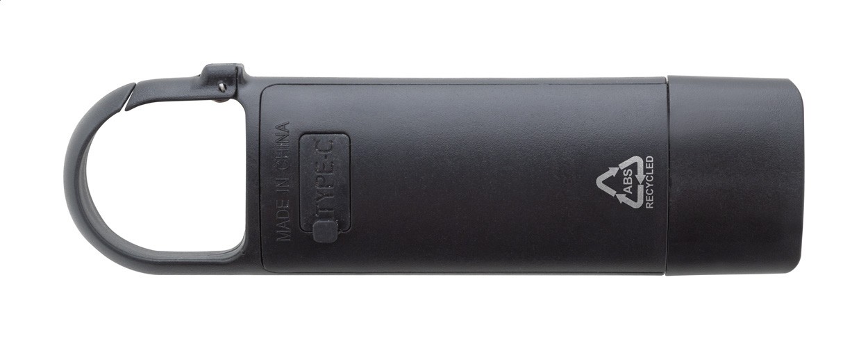 Mini lanternă din ABS reciclat, cu baterie reîncărcabilă USB încorporată (200 mAh) și carabină. Cu lumină COB la font și proiector COB pe lateral. Cu 3 moduri de iluminare. Inclusiv cablu de încărcare USB.