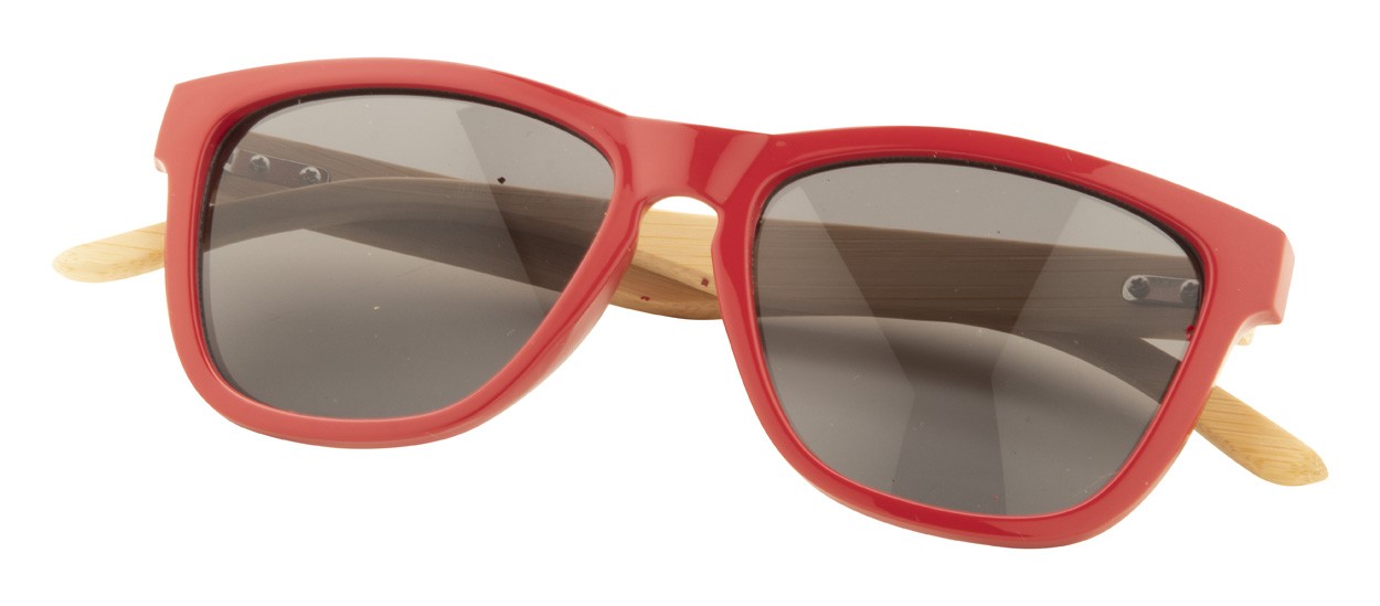 Ochelari de soare cu ramă din plastic colorat și brațe din bambus.