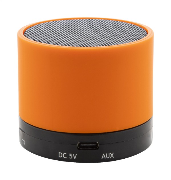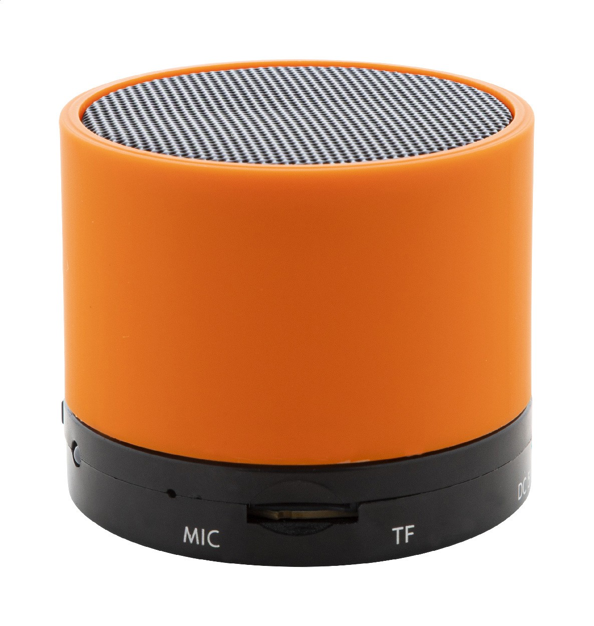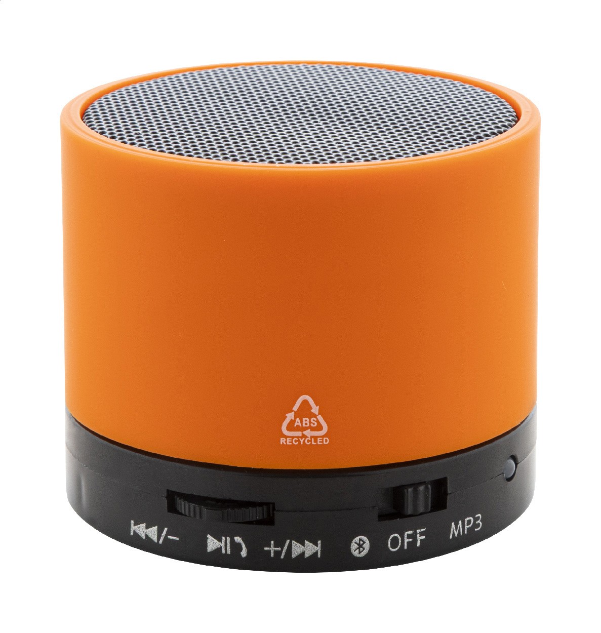 Boxă wireless, din ABS reciclat, cu carcasă cauciucată, cu plasă metalică și baterie reîncărcabilă (300 mAh). Cu funcții de apelare hands-free și redare MP3 cu card micro SD. Include cablu de încărcare USB.