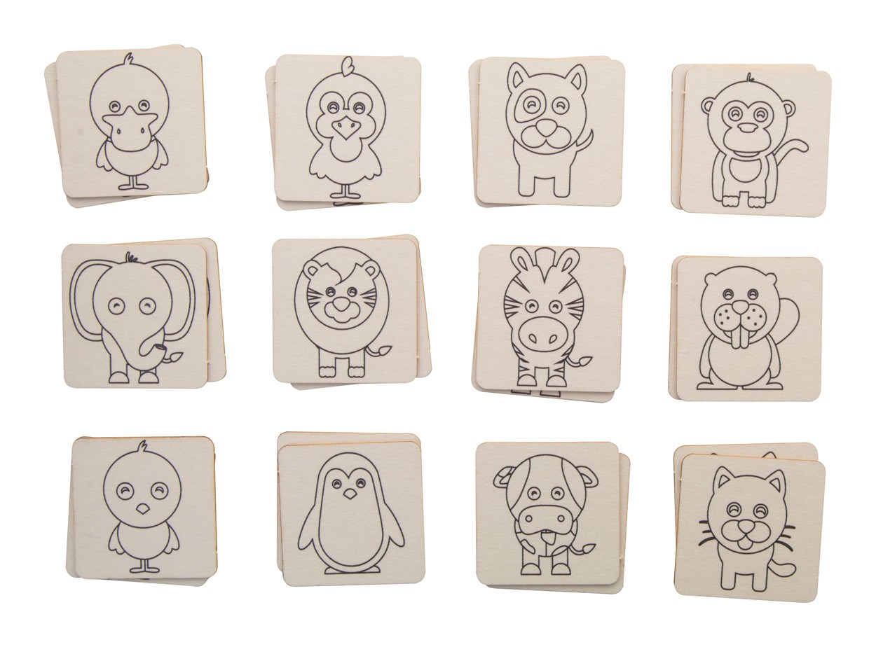 Joc de memorie de colorat, în husă de transport din bumbac. Include joc tematic de memorie din carton (24 de plăci) și creioane colorate din lemn (12 buc) în cutie de hârtie.