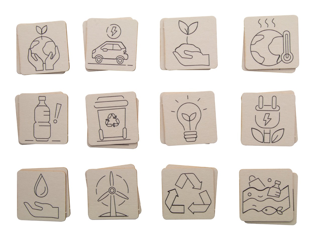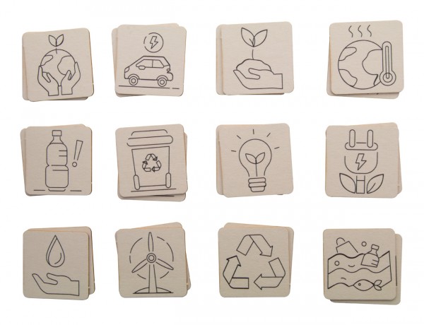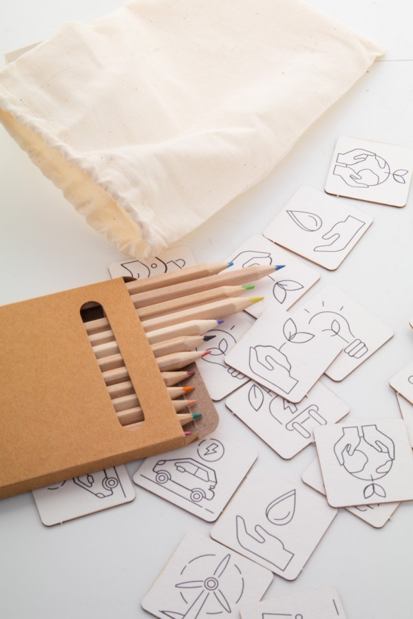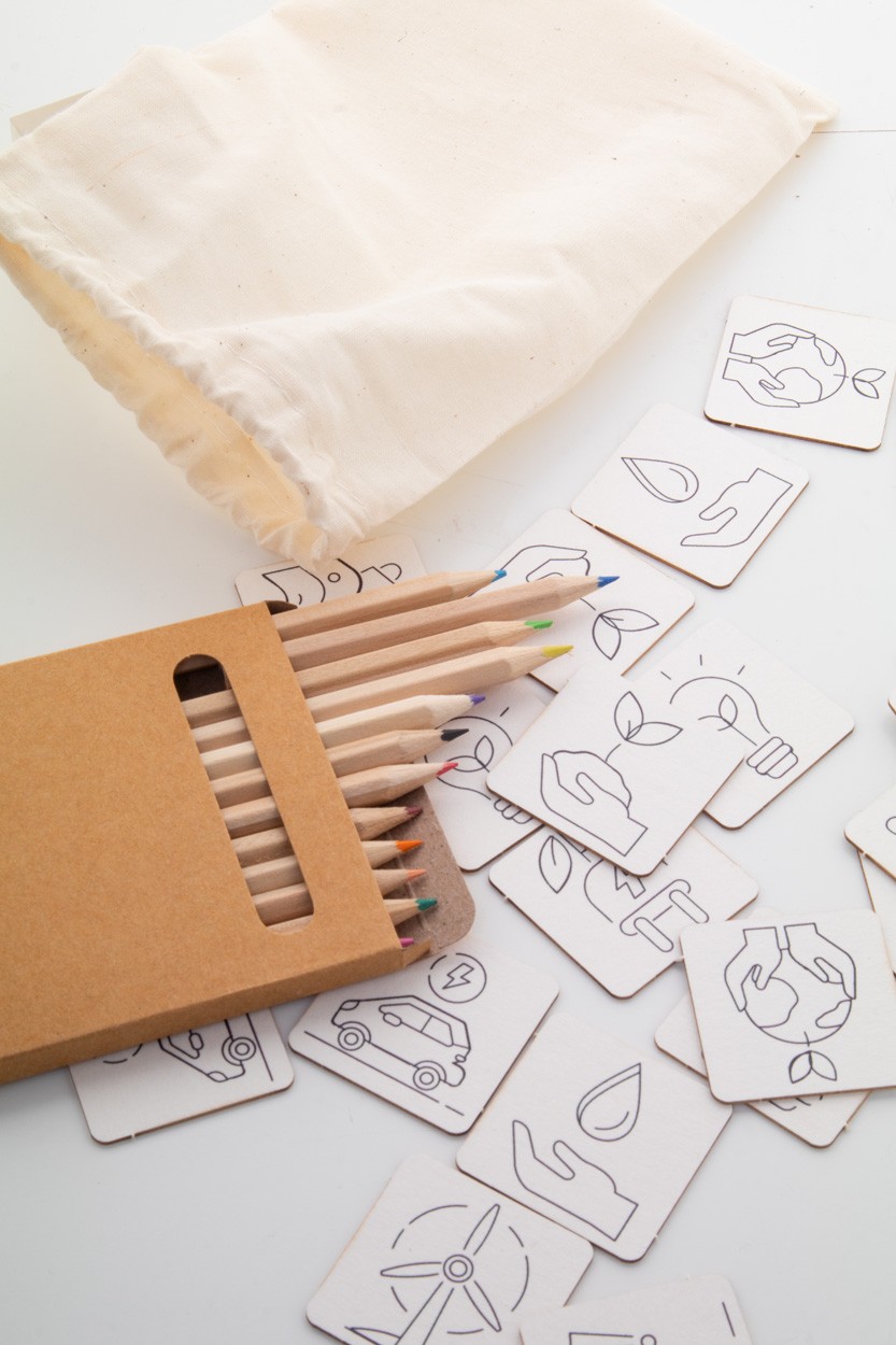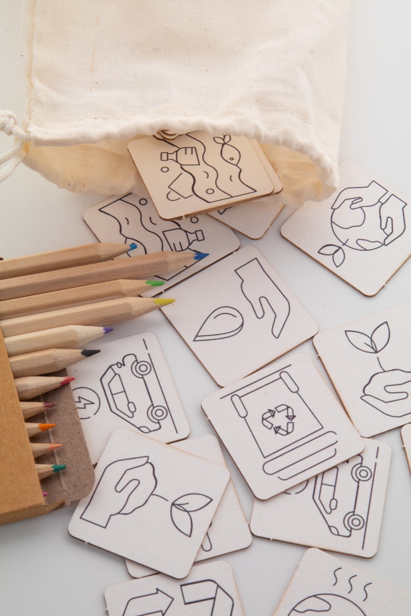 Joc de memorie de colorat, în husă de transport din bumbac. Include joc tematic de memorie din carton (24 de plăci) și creioane colorate din lemn (12 buc) în cutie de hârtie.