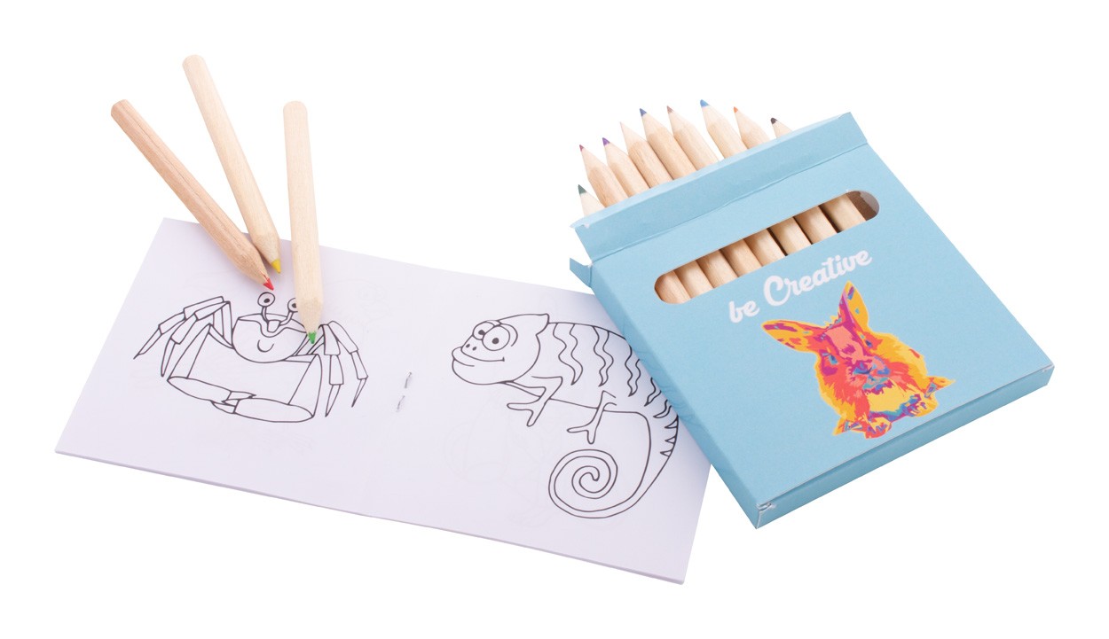 Set de colorat, la comandă, în cutie de hârtie imprimată color. Inclusiv creioane colorate din lemn (12 buc) și carte de colorat tematică. MOQ: 100 buc.