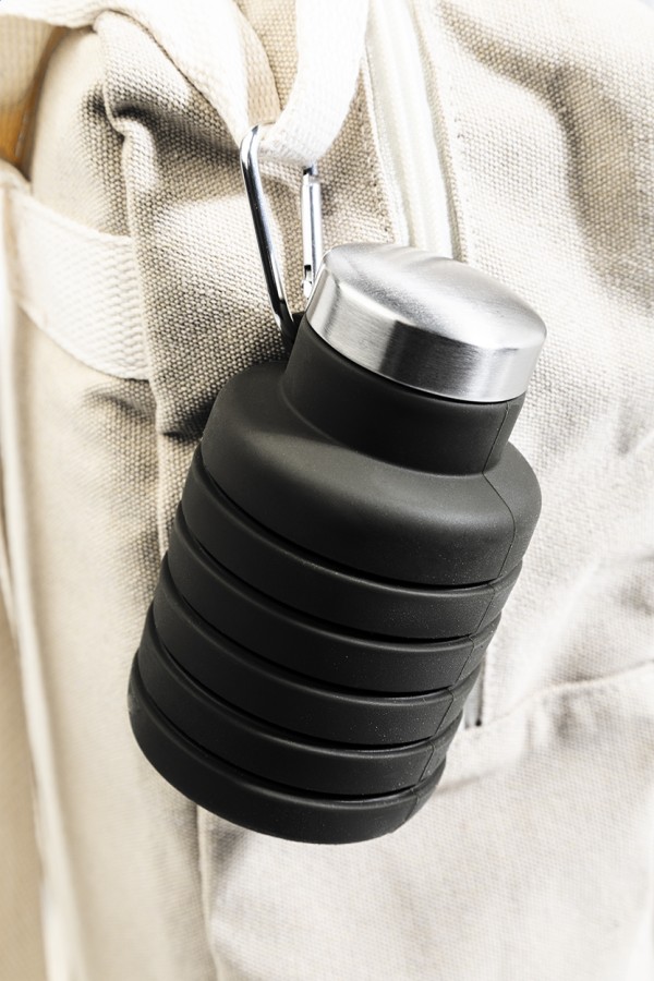 Sticlă pliabilă, din silicon, cu capac din oțel inoxidabil și carabină din aluminiu. 500 ml.