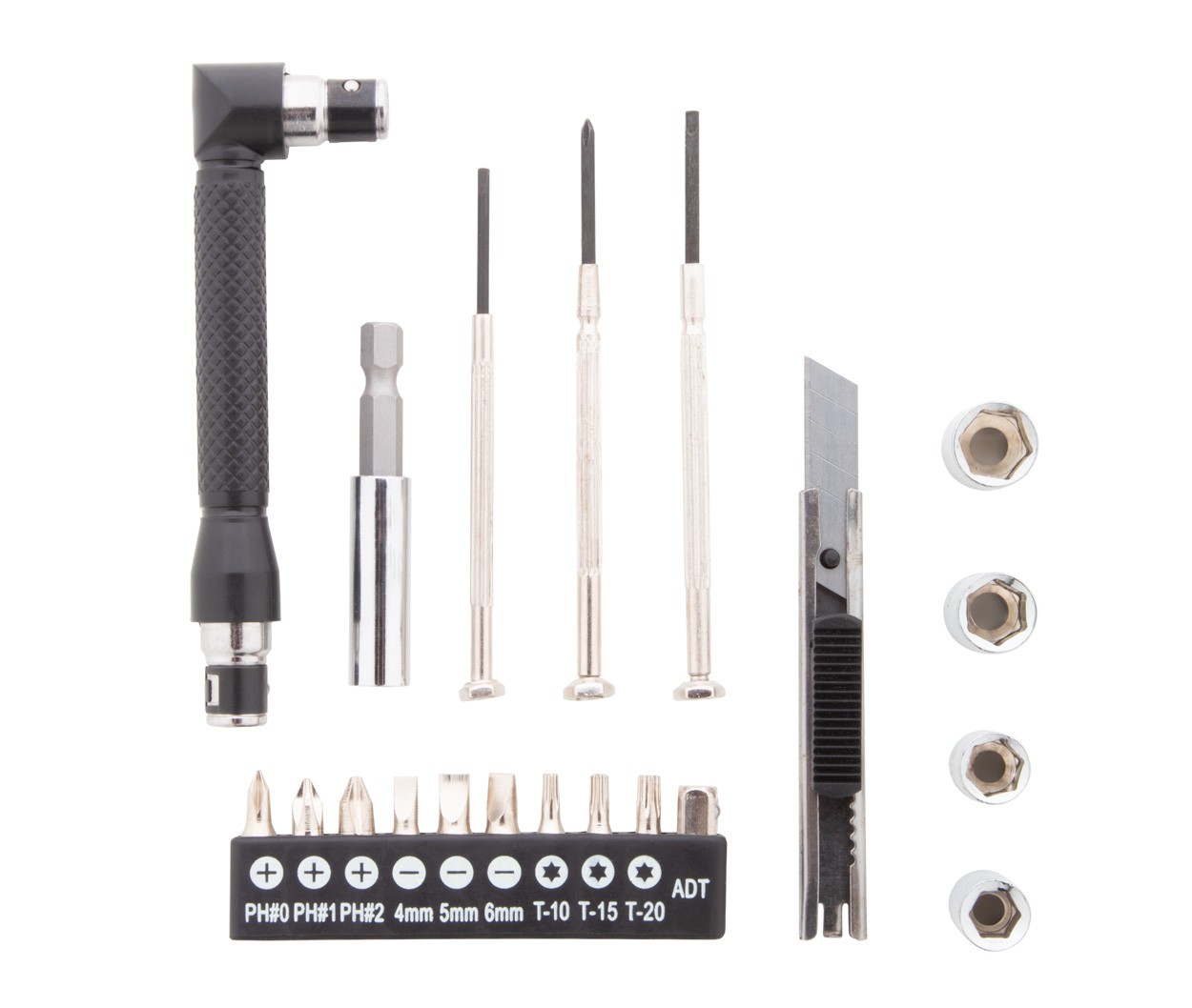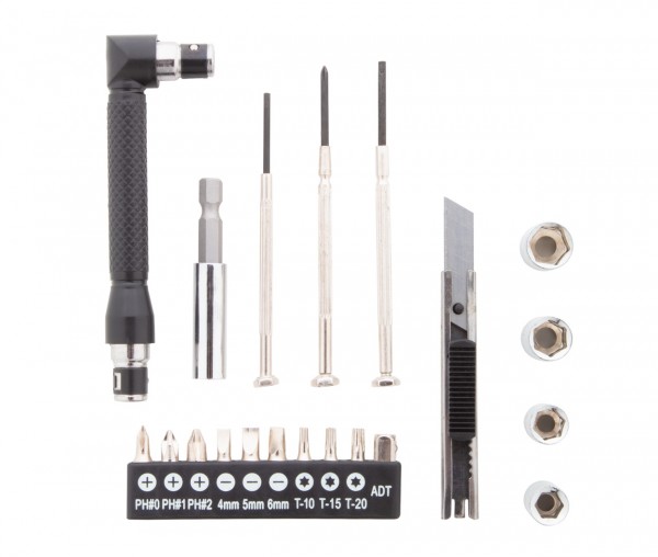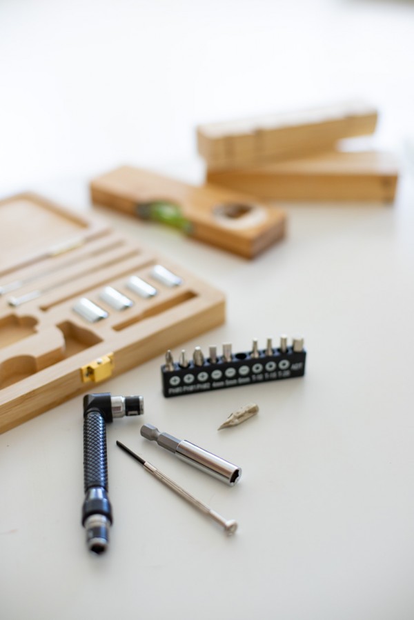 Set de scule metalice de 21 buc în cutie de bambus. Include 1 șurubelniță, 1 cuțit de hârtie, 3 șurubelnițe de precizie, set de 10 bucăți de capete de șurubelniță, în suport, 4 set de piulițe și 1 prelungitor.