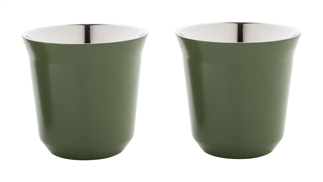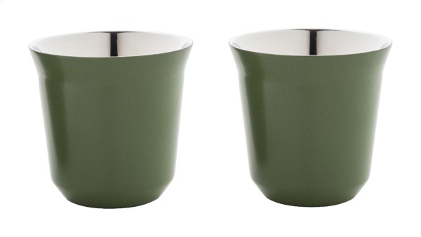 Set de 2 cănitermoizolante, pentru espresso, cu pereți dubli în formă de capsulă de cafea, din oțel inoxidabil reciclat, 80 ml. În cutie de hârtie kraft.