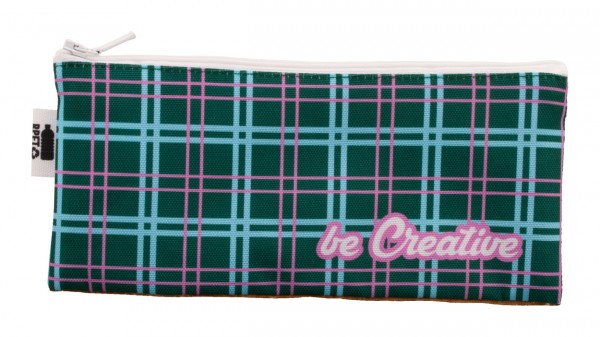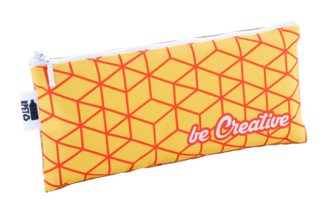 Husă pentru stilouri, cu fermoar, realizată la comandă, din poliester 600D RPET, cu spate din plută naturală. Cu grafică imprimată prin sublimare și etichetă RPET distinctivă. MOQ: 50 buc.