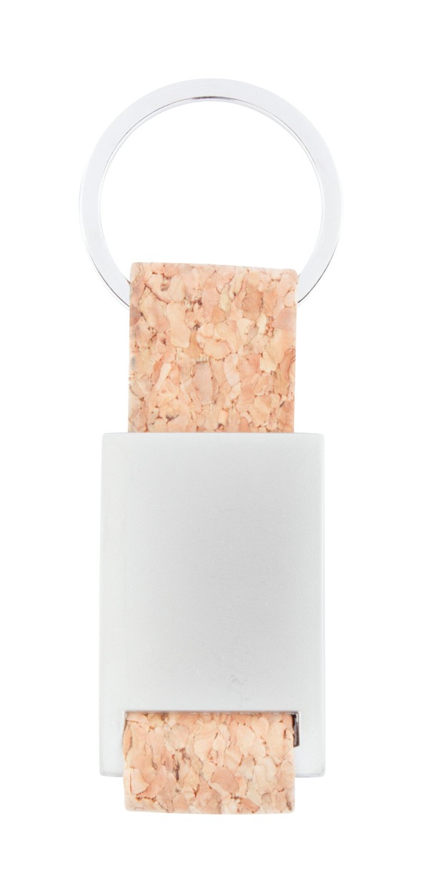 Breloc dreptunghiular metalic cu curea din plută naturală și inel metalic.