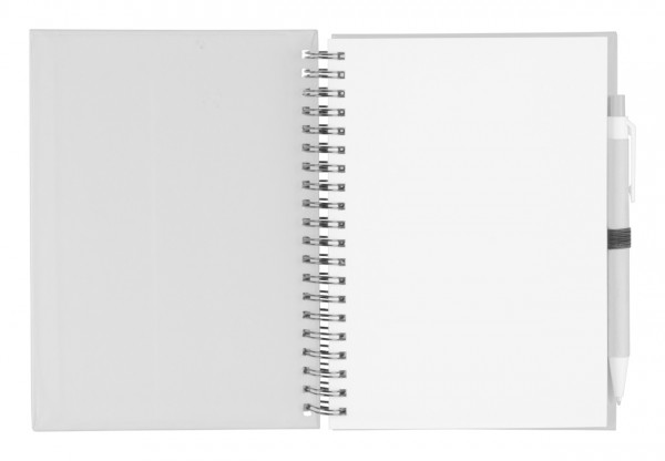 Blocnotes spiralat cu 70 file veline, copertă din caton, cu pix de aceeași culoare din carton reciclabil. Mină albastră.