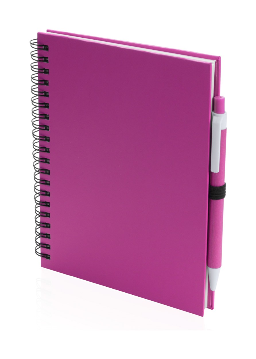 Blocnotes spiralat cu 70 file veline, copertă din caton, cu pix de aceeași culoare din carton reciclabil. Mină albastră.
