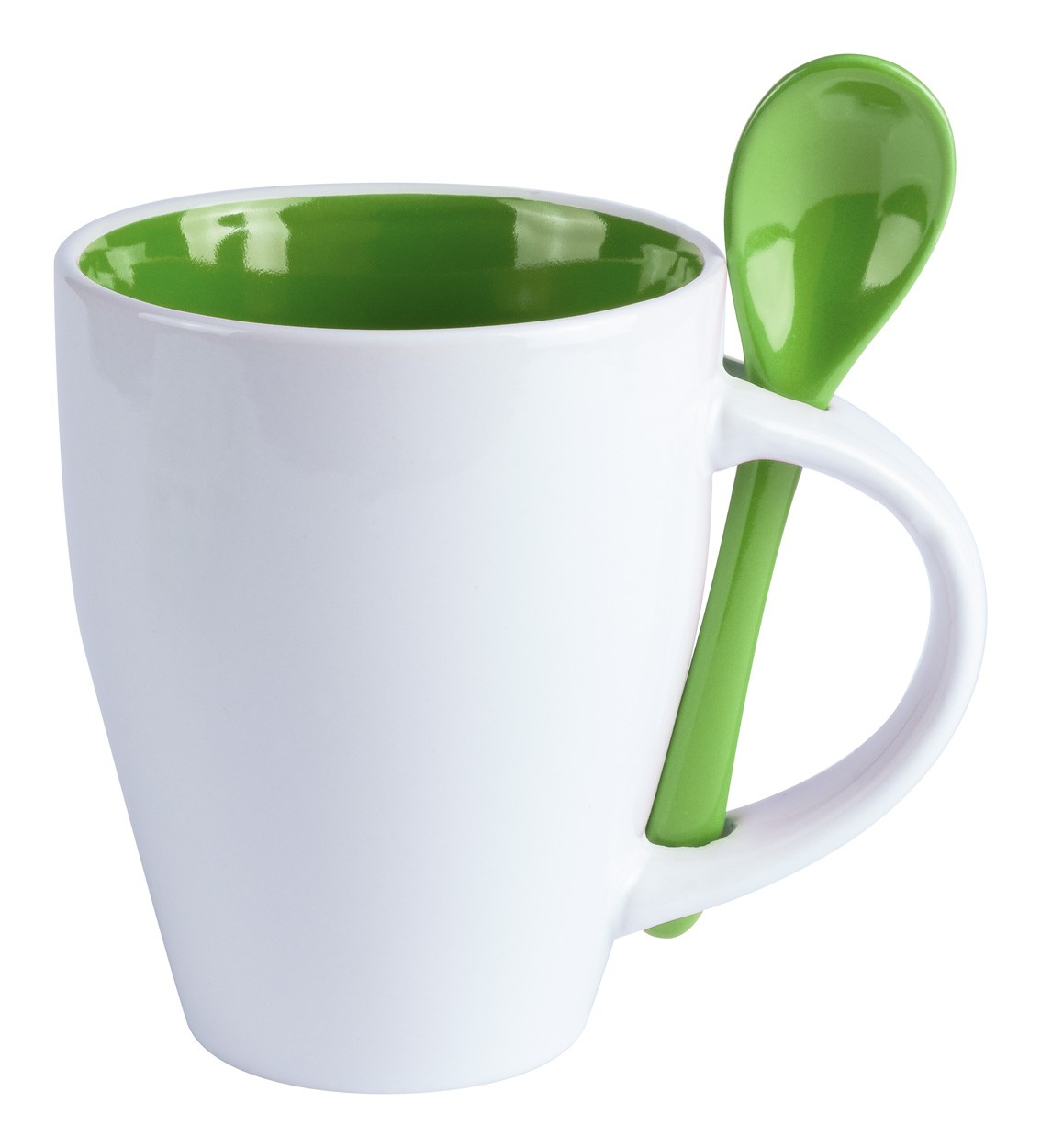 Cană ceramică cu interior colorat și exterior alb, cu linguriță, 350 ml.