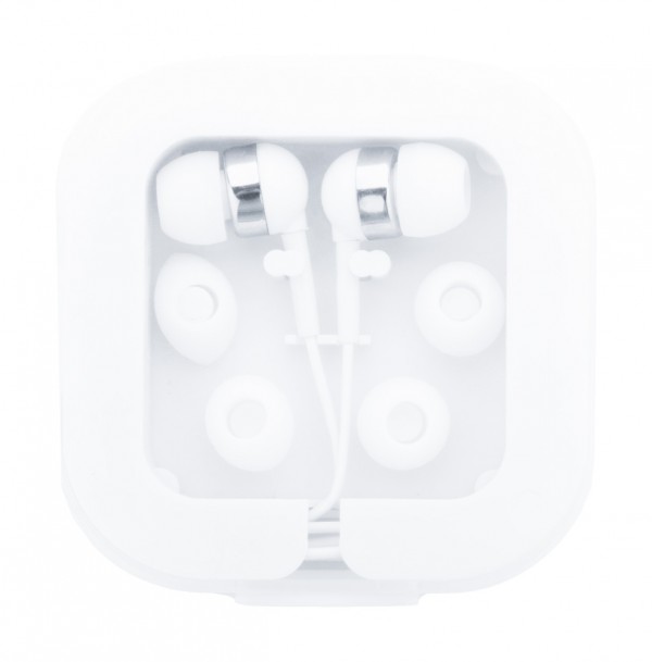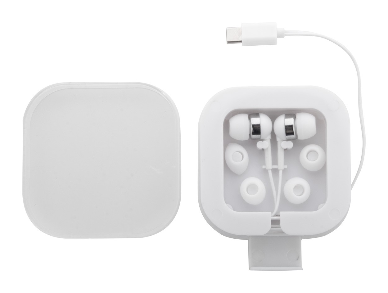 Căști intraauriculare, cu conexiune digitală USB-C și 3 perechi de căști, în carcasă din plastic cu funcție de suport mobil.