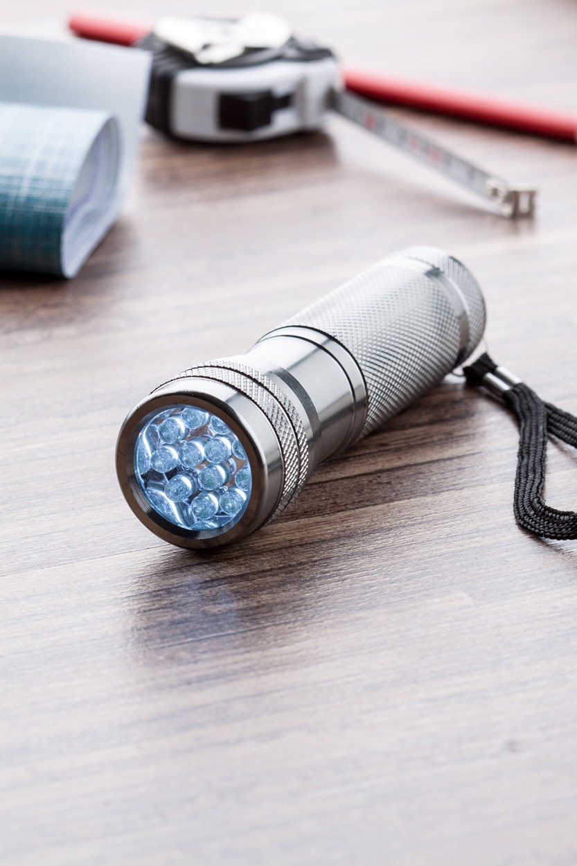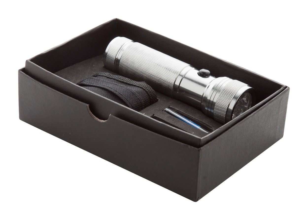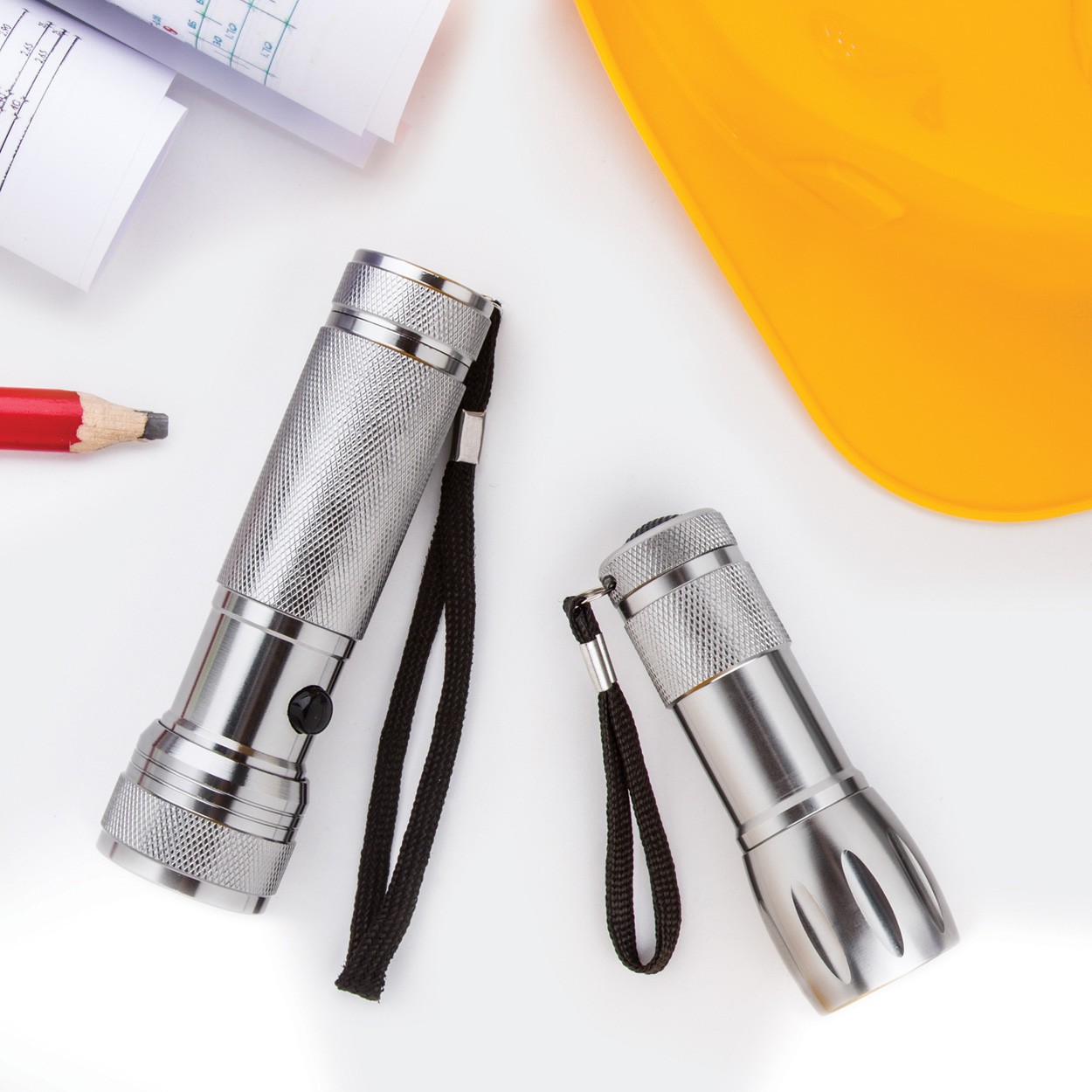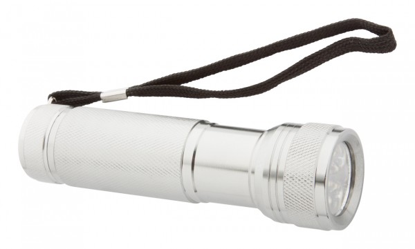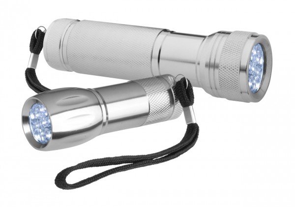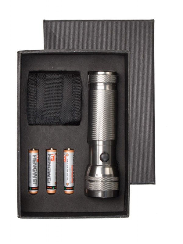 Lanterna 12 LEDuri, din metal cu etui din poliester, ambalat in cutie neagra cadou. Baterii incluse.