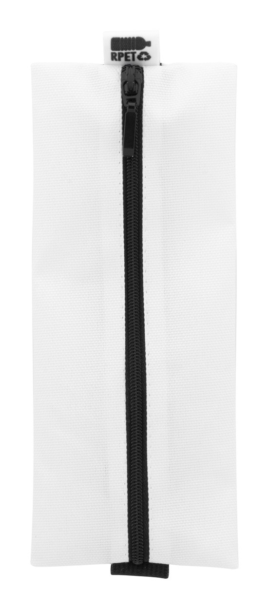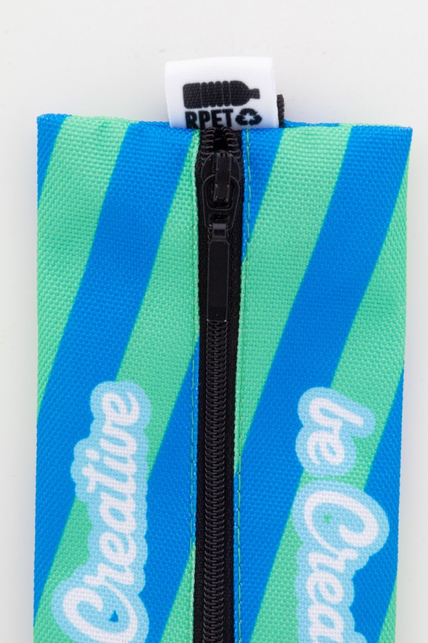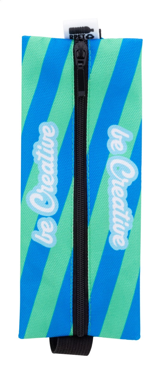 Penar cu fermoar, realizat la comandă, din poliester 600D RPET, cu bandă de cauciuc pentru atașarea la o husă de notebook. Cu grafică imprimată prin sublimare și etichetă RPET distinctă. MOQ: 50 buc.