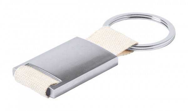 Breloc dreptunghiular, metalic, cu curea din bumbac și inel metalic.