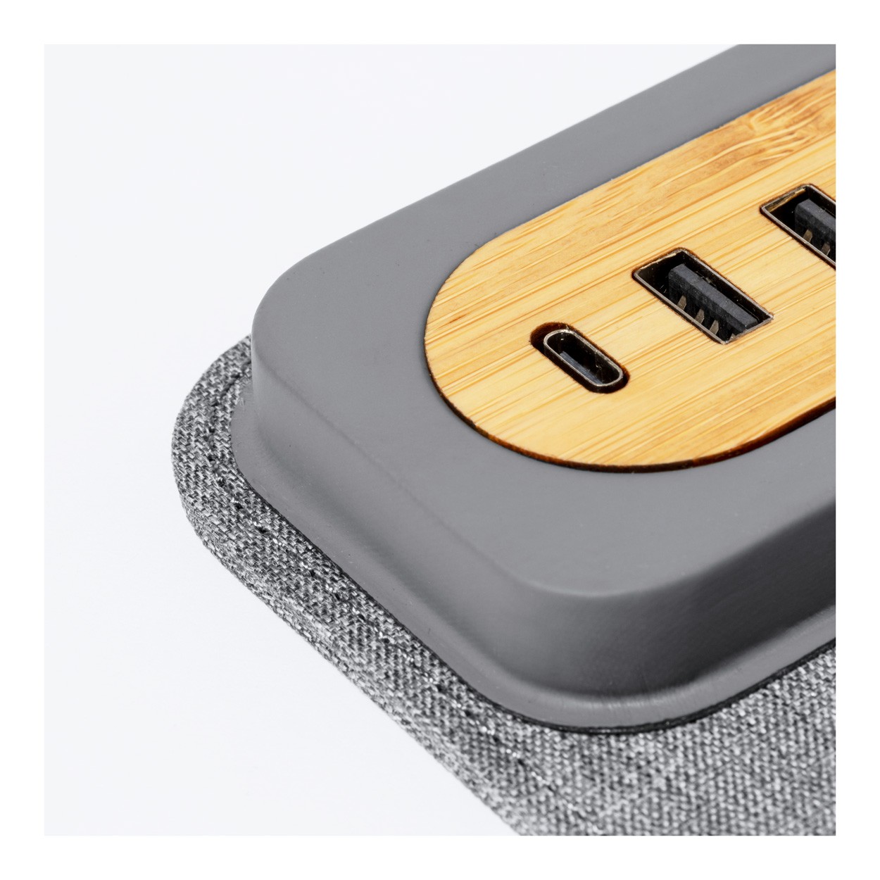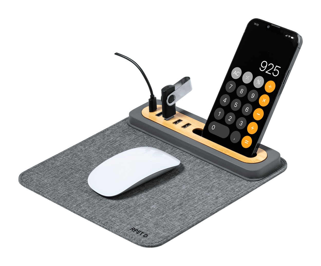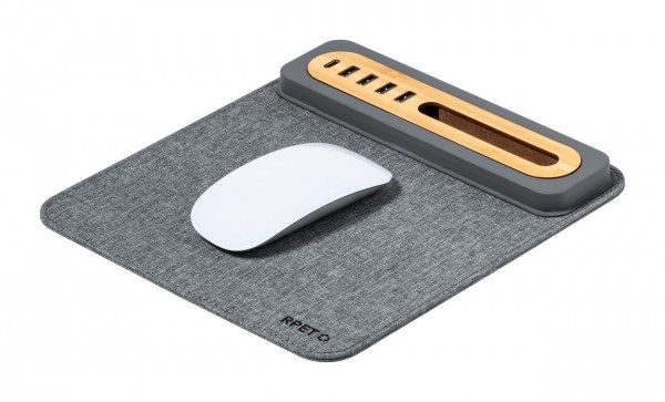 Mousepad din poliester 300D RPET, cu bază din silicon și suport telefon mobil din bambus. Cu 4 porturi USB și 1 USB-C pentru încărcător, USB 2.0.
