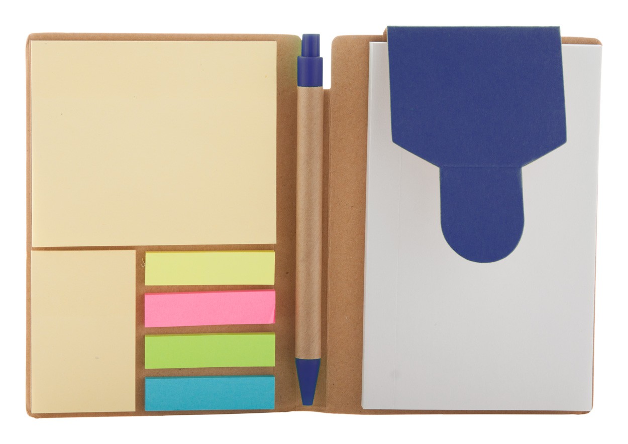 Blocnotes(70 file)și pix(mină albastră) din hârtie reciclabilă, notițe cu adeziv(25 buc mari, 25 buc medii, 100 buc mici).