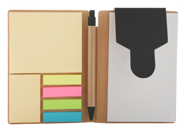 Blocnotes(70 file)și pix(mină albastră) din hârtie reciclabilă, notițe cu adeziv(25 buc mari, 25 buc medii, 100 buc mici).