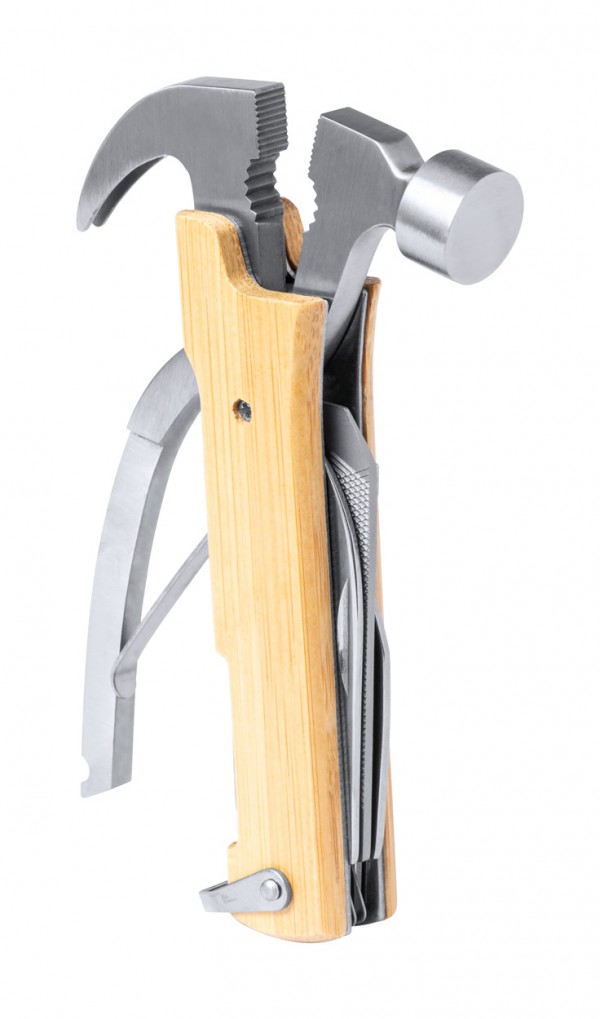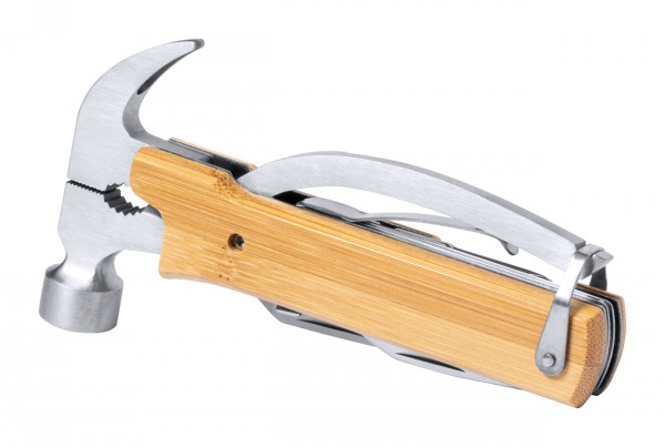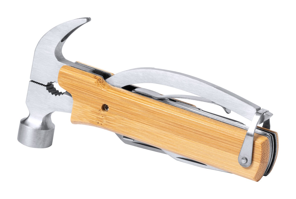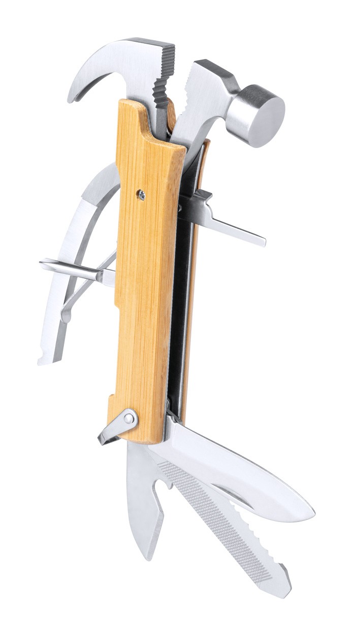 Unealtă multifuncțională, din oțel inoxidabil, cu 13 funcții și mâner din bambus.