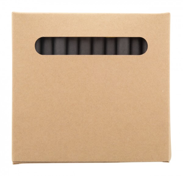 Creioane colorate (12 buc), acoperite in hârtie neagră, în cutie de hârtie kraft imprimată color. Prețul include imprimarea digitală. MOQ: 100 buc