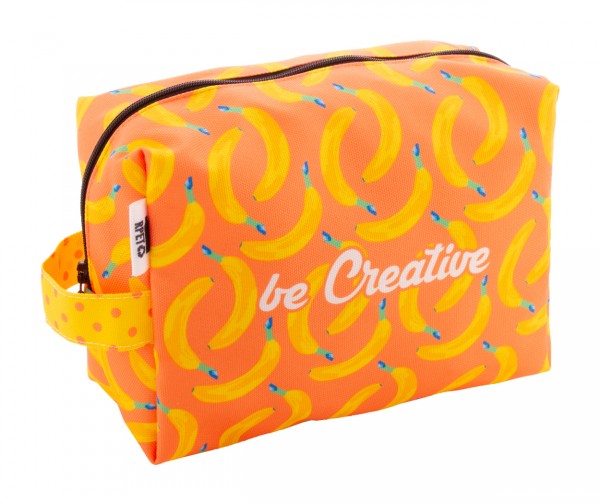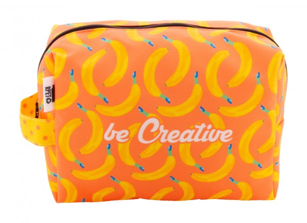 Geantă cosmetică RPET, realizată la comandă, cu fermoar, din poliester RPET 600D, cu mâner de transport. Cu grafică imprimată prin sublimare integrală. MOQ: 50 buc.