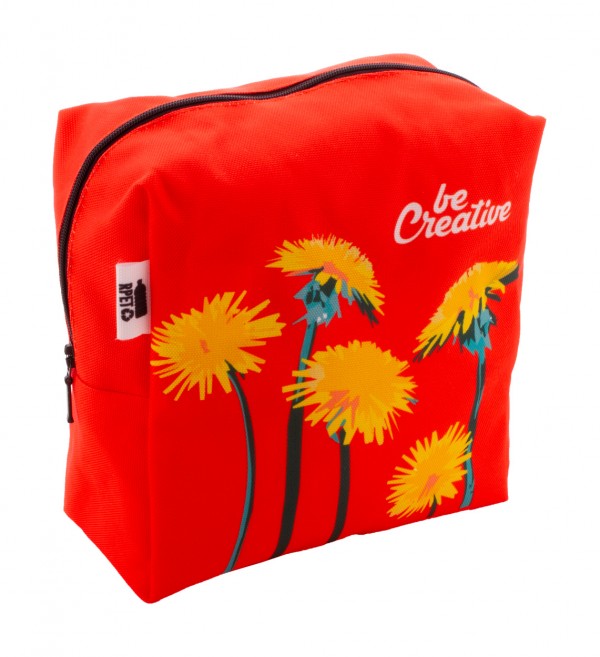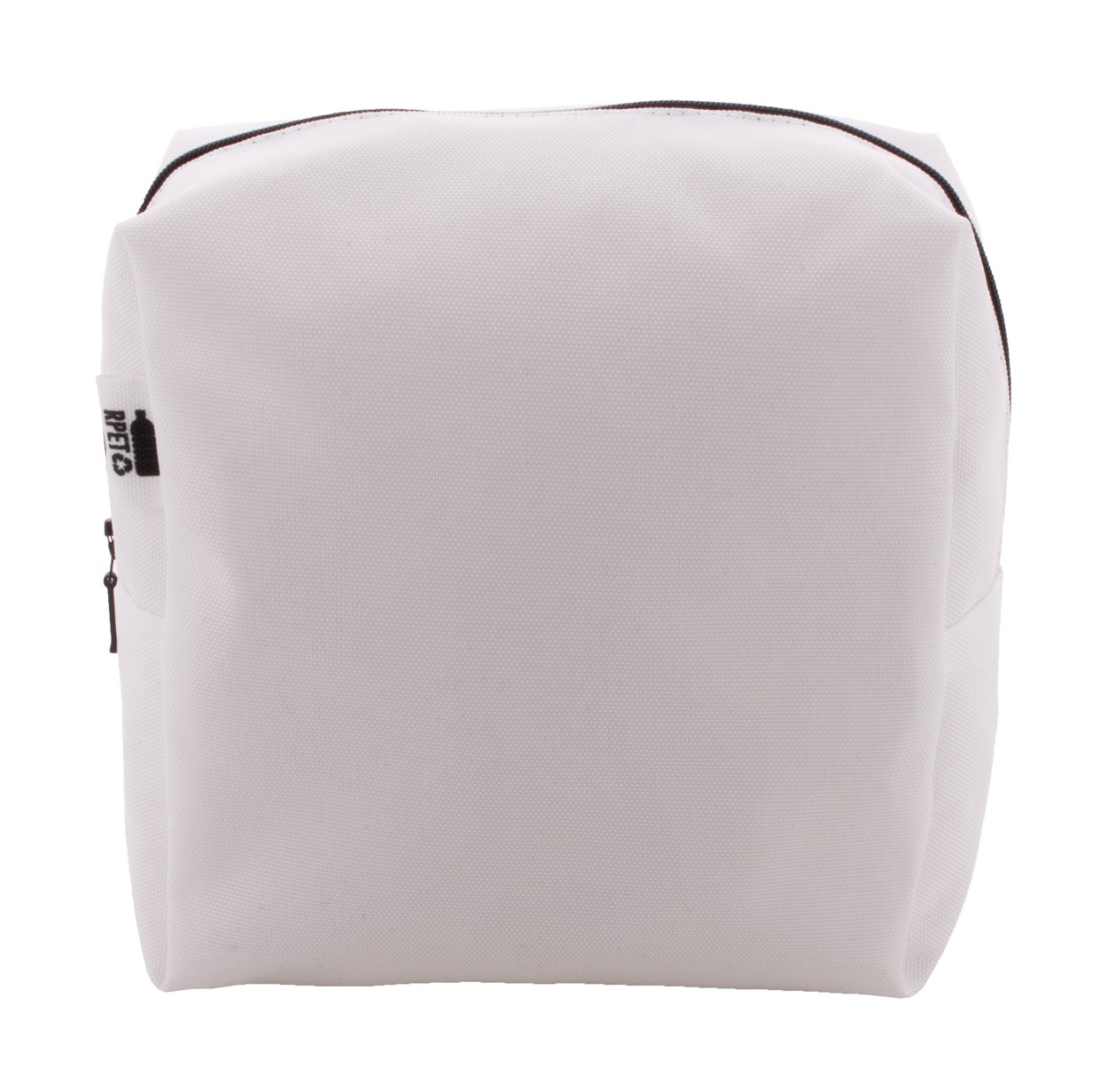 Geantă cosmetică, cu fermoar, în formă pătrată, realizată la comandă, din poliester 600D RPET. Cu grafică imprimată prin sublimare integrală. MOQ: 50 buc.