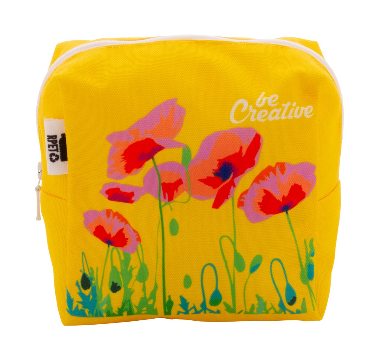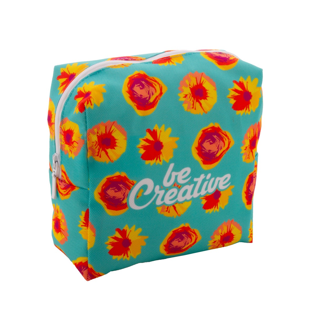 Geantă cosmetică, cu fermoar, în formă pătrată, realizată la comandă, din poliester 600D RPET. Cu grafică imprimată prin sublimare integrală. MOQ: 50 buc.