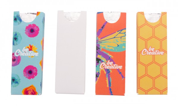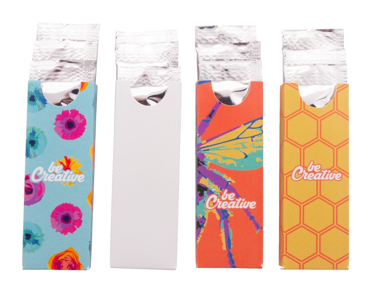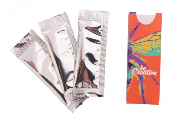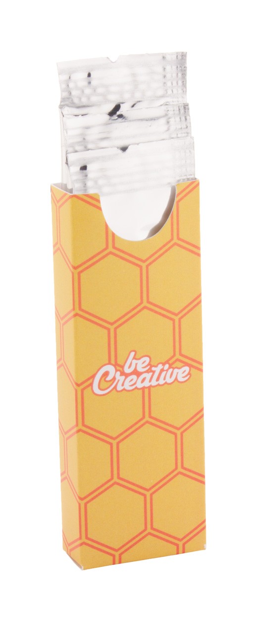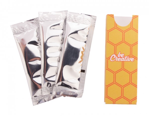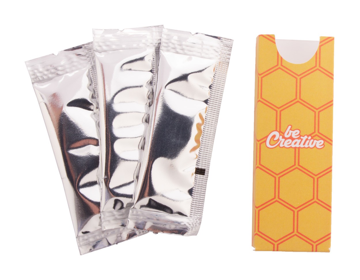 Trei pachete unice de miere (3x10 grame), în husă de hârtie imprimată la comandă, colorată. MOQ: 100 buc.
