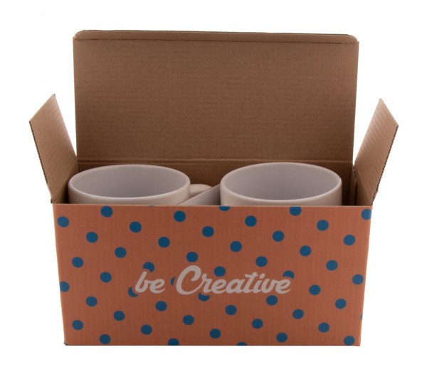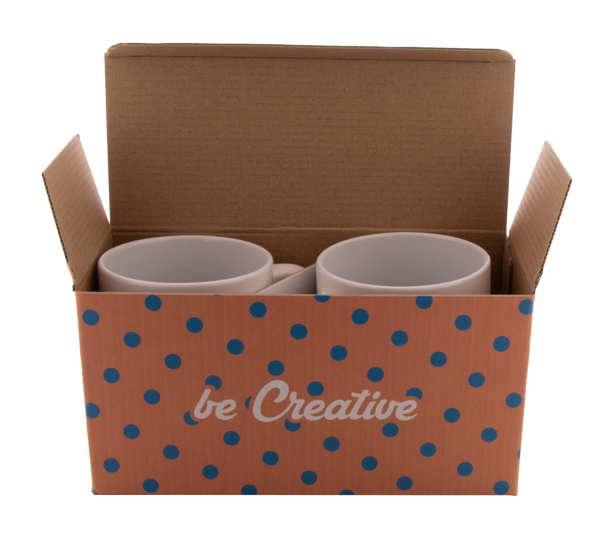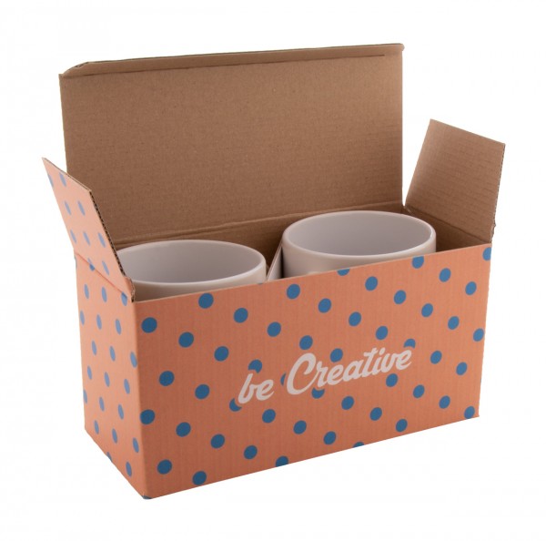 Cutie din carton ondulat, imprimată la comandă, pentru 2 bucăți căni de 300-350 ml. MOQ: 50 buc.