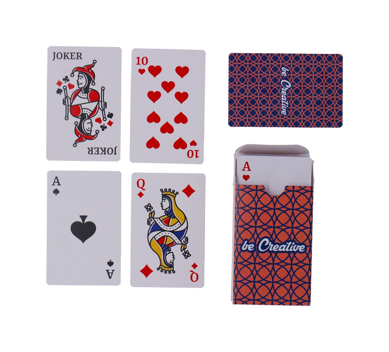 Cărți de joc clasice, făcute la comandă, în cutie de hârtie. Un pachet standard cu 54 de cărți. Prețul include cutia imprimată color și o imprimare identică color pe partea din spate a fiecărei cărți. MOQ: 100 buc.