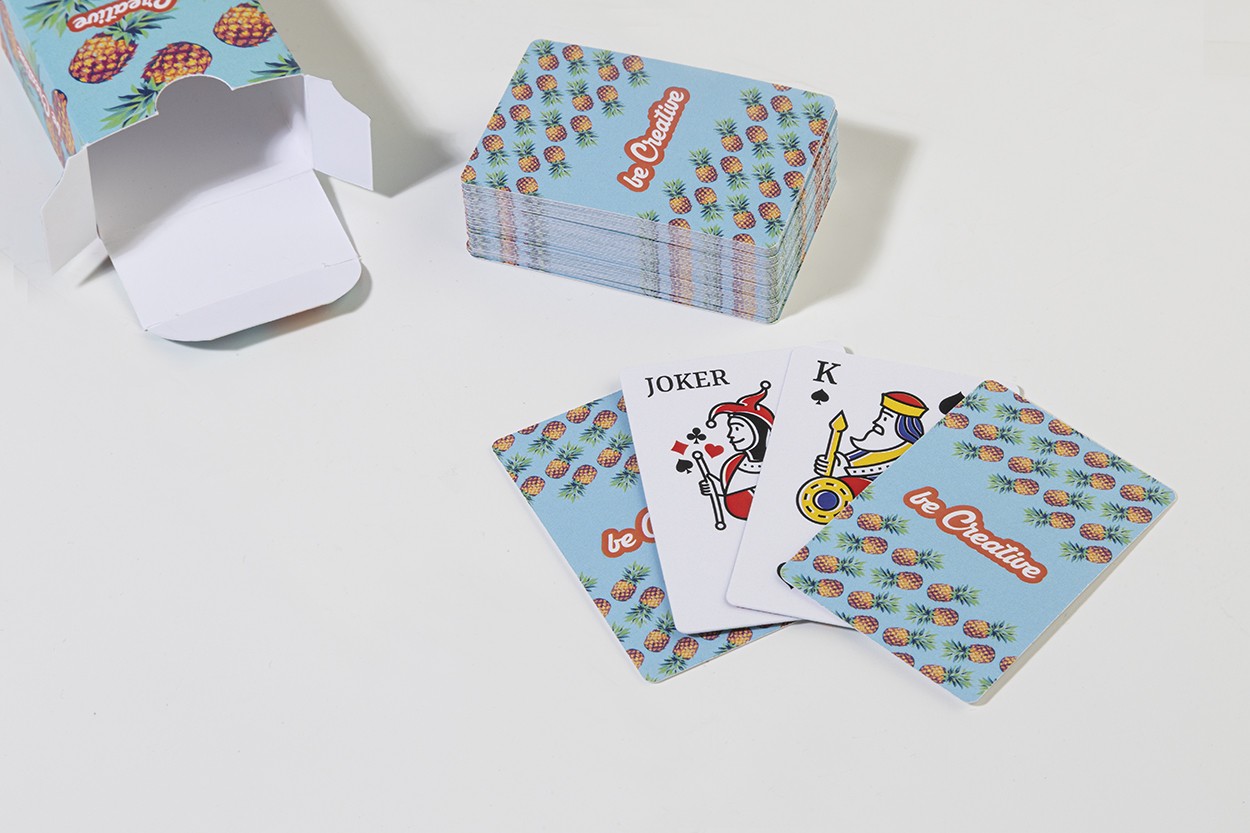 Cărți de joc clasice, personalizate, în format mini, pentru călătorii, în cutie de hârtie. Un pachet standard cu 54 de cărți. Prețul include cutia imprimată color și o imprimare color identică pe spatele fiecărei cărți. Cantitate minimă de comandă: 100 bucăți.