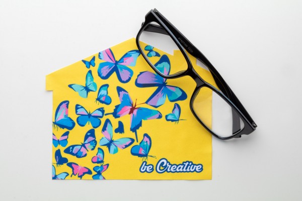 Lavetă de curățat, din microfibră RPET (170 g/m²) pentru ochelari și ecrane, realizată la comandă. Produs într-o formă unică cu design imprimat prin sublimare. MOQ: 100 buc.