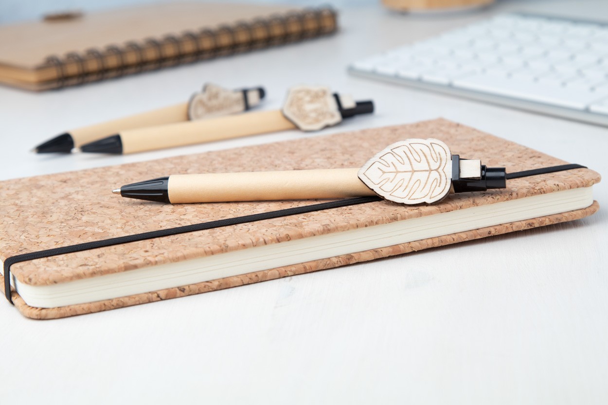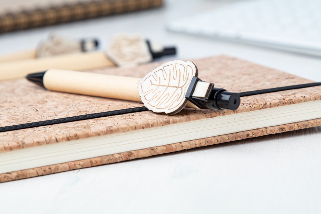 Pix din hârtie reciclată, cu clemă de placaj personalizată și mina albastră. Clipul este realizat in forma personalizata - dimensiune maxima: 25×35 mm. Pretul include gravarea logo-ului pe clip. MOQ: 100 buc.