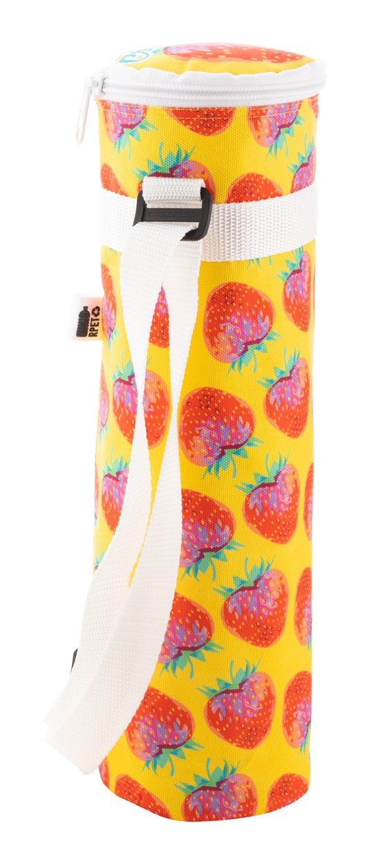 Geantă frigorifică pentru sticle, realizată la comandă, cu fermoar, din poliester 600D RPET, cu căptușeală din aluminiu și curea de umăr reglabilă. Ideal pentru o sticla de 1,5 L. Cu grafică imprimată prin sublimare și etichetă distinctivă RPET. MOQ: 25 buc.