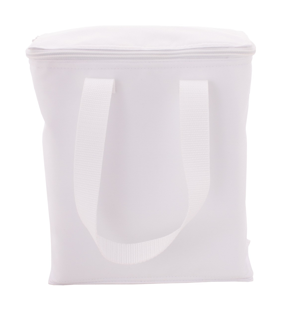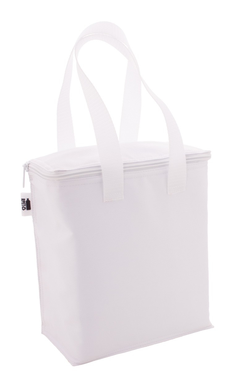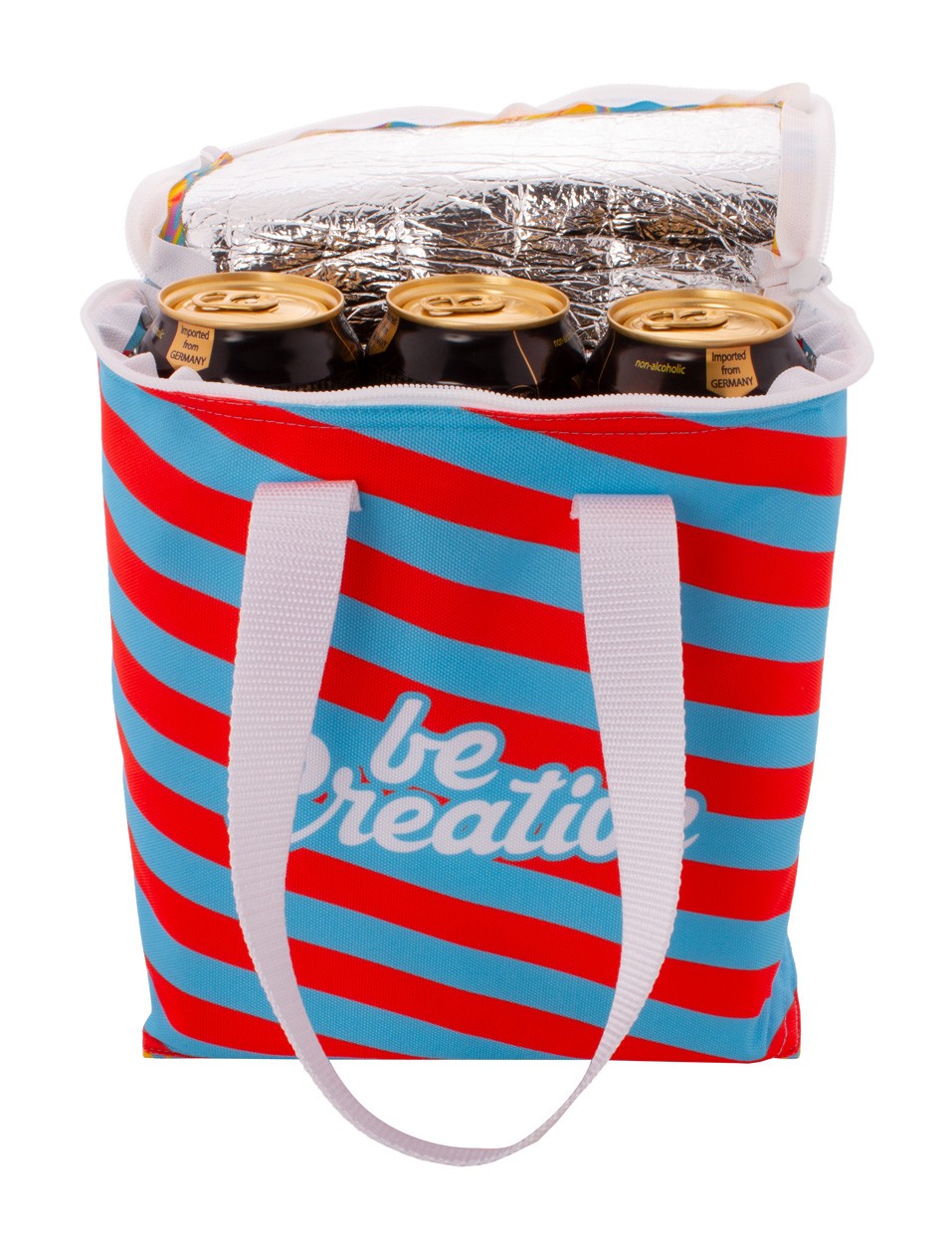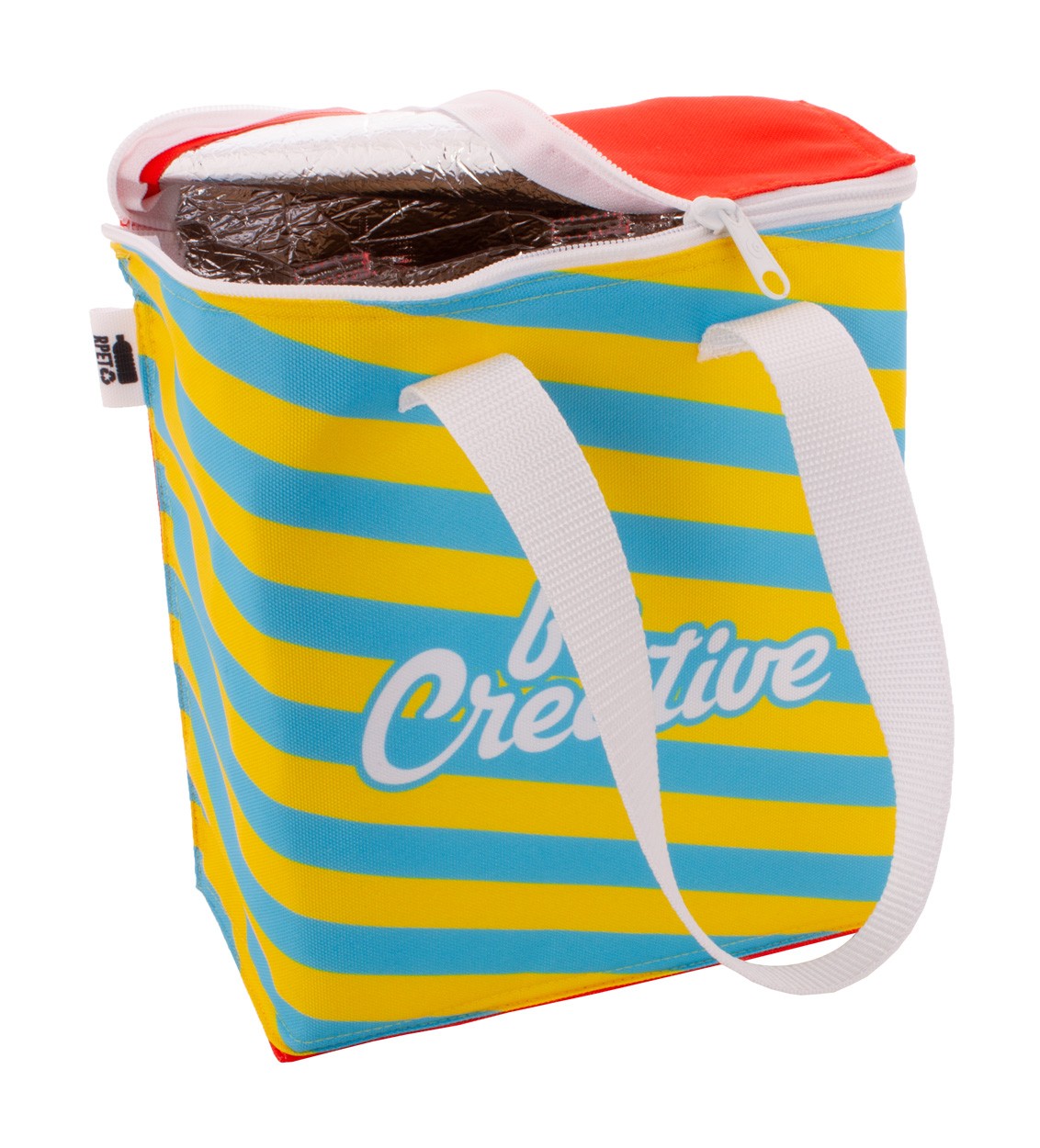 Geantă frigorifică, personalizată, cu fermoar, din poliester 600D RPET, cu căptușeală din aluminiu, pentru 6 bucăți cutii de 0,33 L. Cu grafică imprimată prin sublimare și etichetă RPET distinctivă. MOQ: 25 buc.