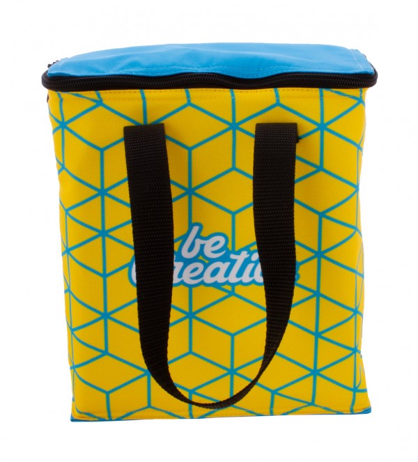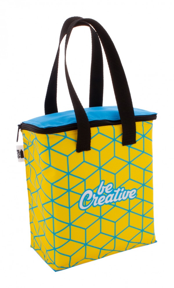 Geantă frigorifică, personalizată, cu fermoar, din poliester 600D RPET, cu căptușeală din aluminiu, pentru 6 bucăți cutii de 0,33 L. Cu grafică imprimată prin sublimare și etichetă RPET distinctivă. MOQ: 25 buc.